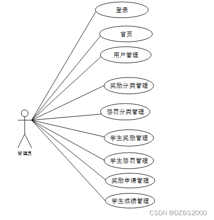 基于学生惩奖系统的设计基于现有的电脑,可以实现管理员,用户管理、奖励分类管理、惩罚分类管理、学生奖励管理、学生惩罚管理、奖励申请管理、学生成绩管理等详细的了解及统计分析。根据系统功能需求建立的模块关系图如下图: