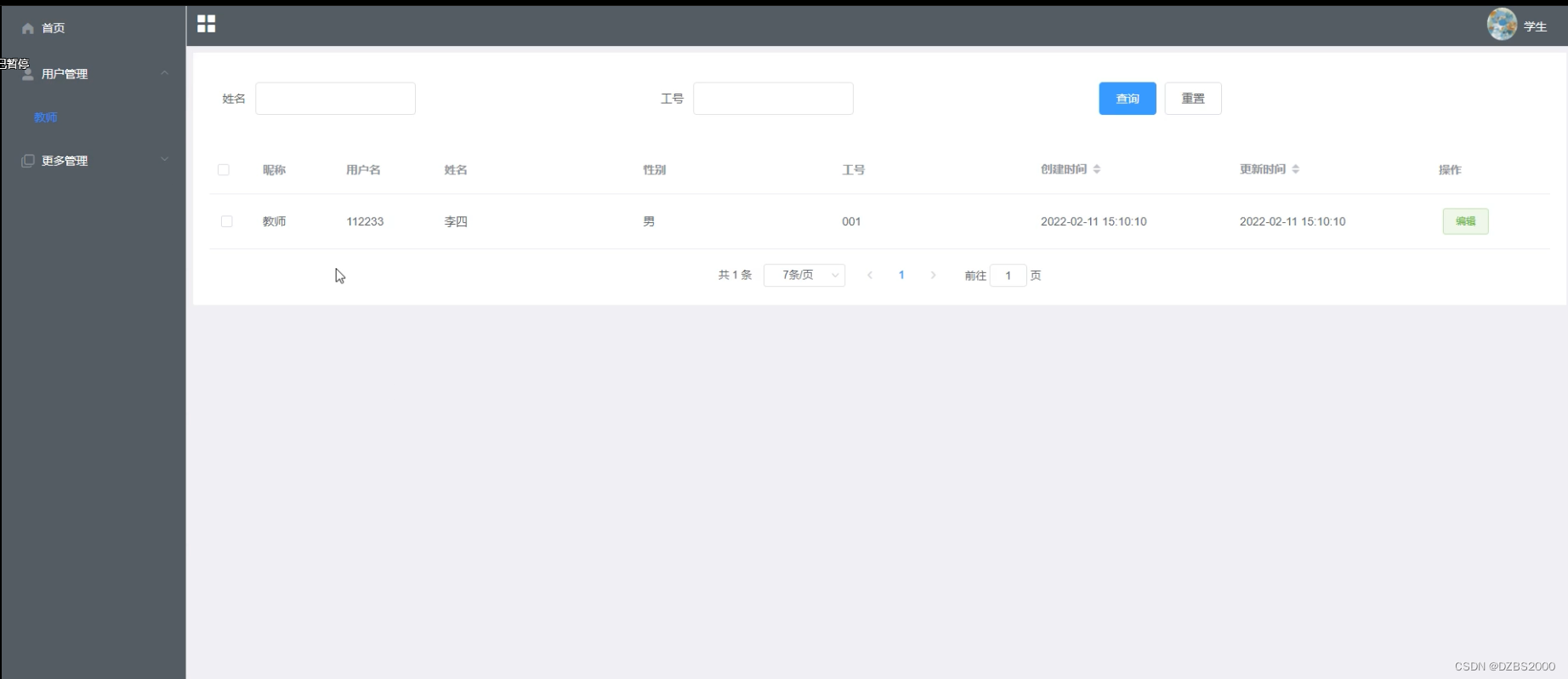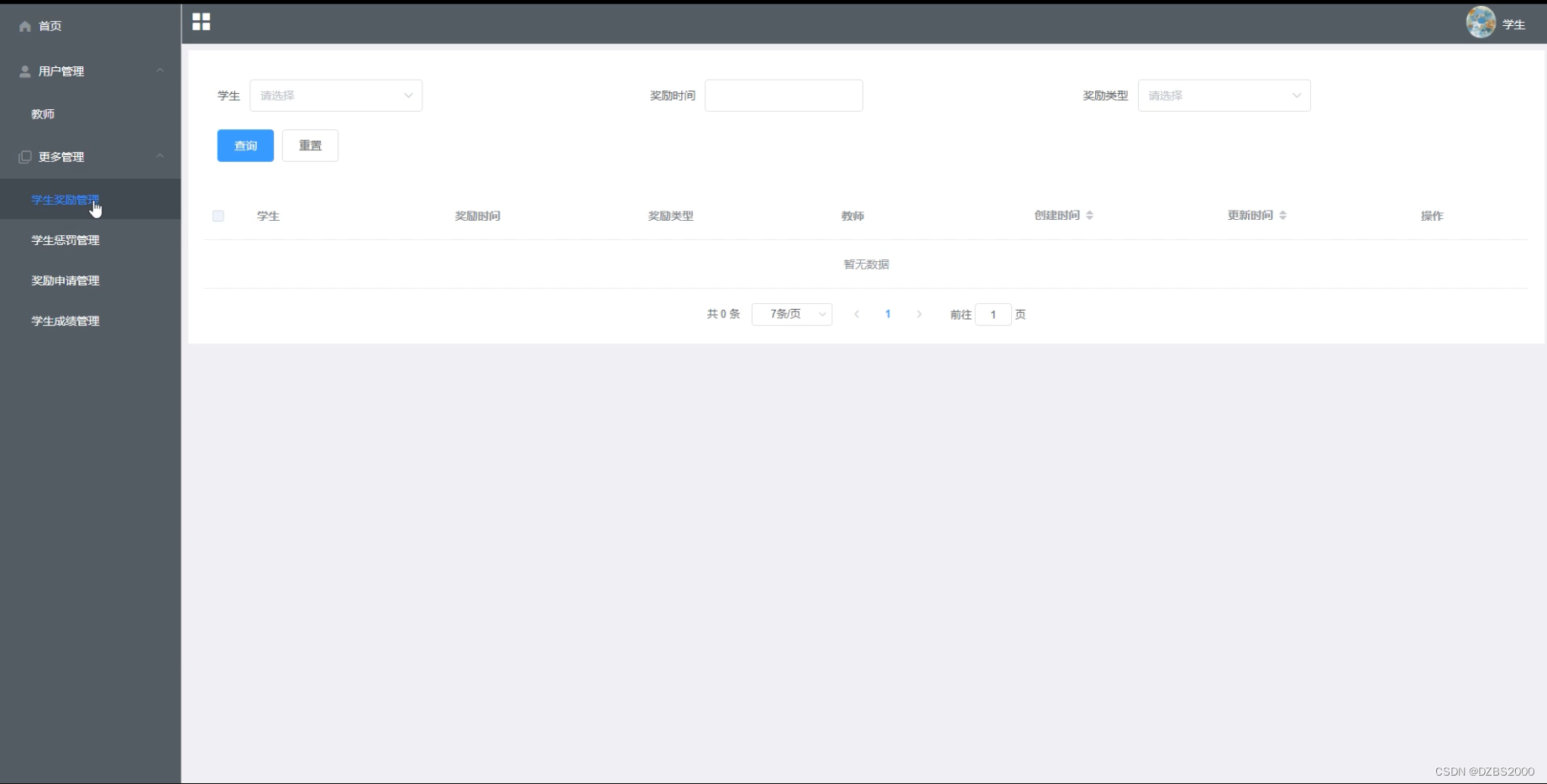 学生奖励管理:在学生奖励管理页面中可以查看学生、奖励时间、奖励类型、教师等内容,进行详情、修改、或删除等详细操作。