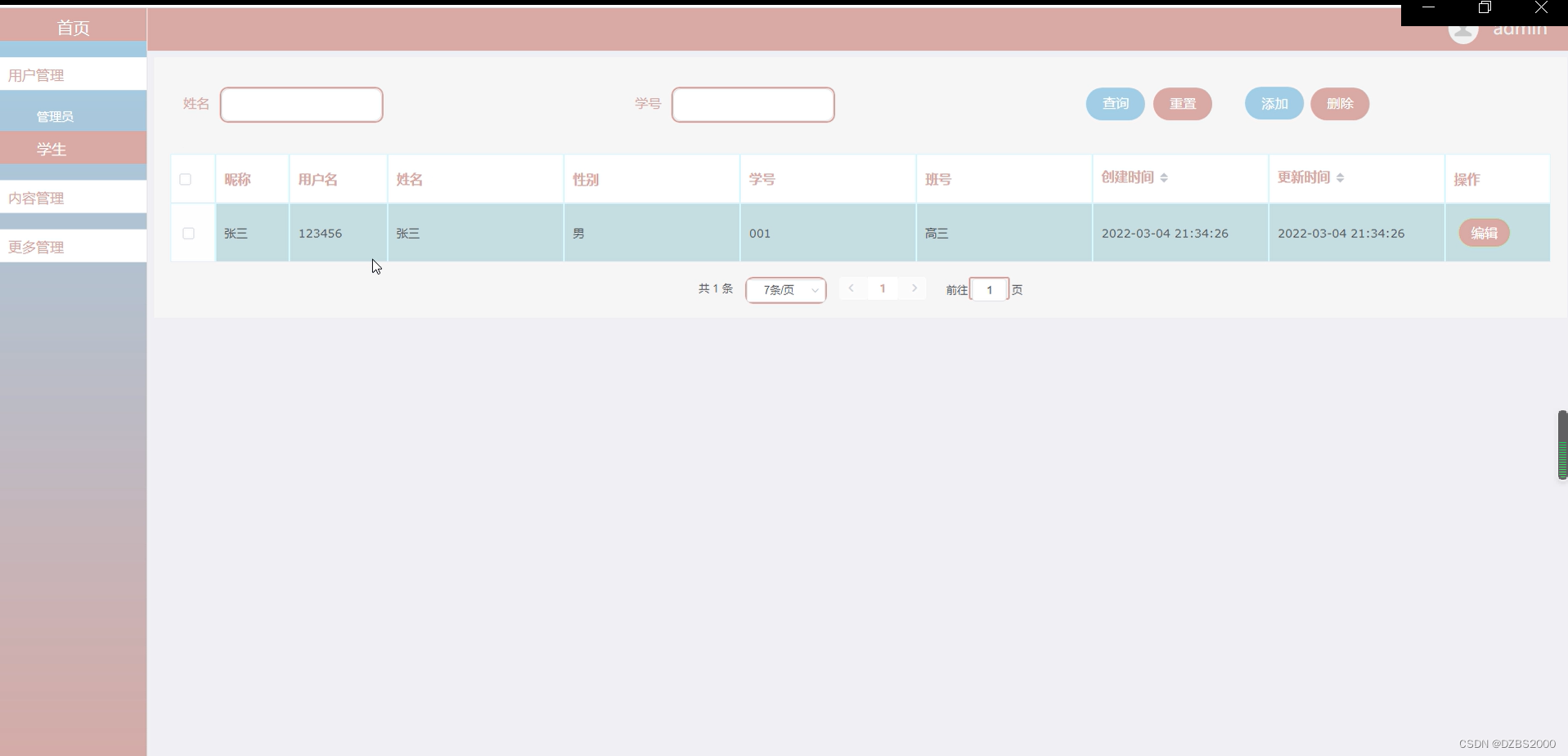 用户管理功能管理界面可查看:昵称、用户名、姓名、性别、学号、班号等信息操作,如图5-5所示。
