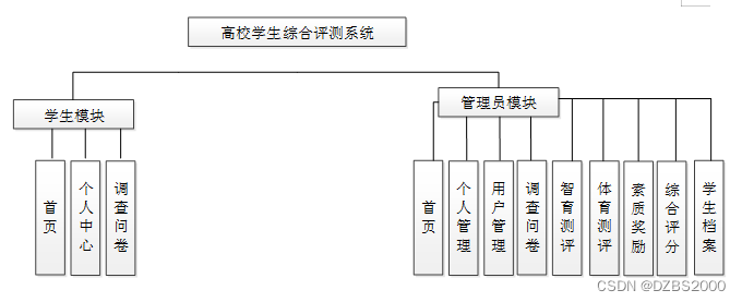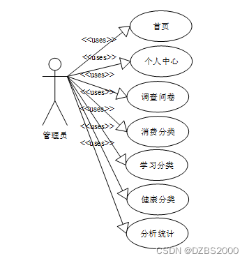 系统设计的目的是分析系统包括的所有功能结构,为开发人员设计开发和实现系统做好准备工作。经过前期的需求调查、分析和整理之后,确定的总体需求主要包括多个模块,分别是:首页、用户管理(管理员、学生)内容管理(调查问卷)更多管理(消费分类、学习分类、健康分类、分析统计)。系统整体角色分为两个部分,一是学生、二是管理员。权限分布也是很明显,学生是在除去浏览信息之外还具有查询和管理自己账户信息、调查问卷;管理员是最高权限拥有者。