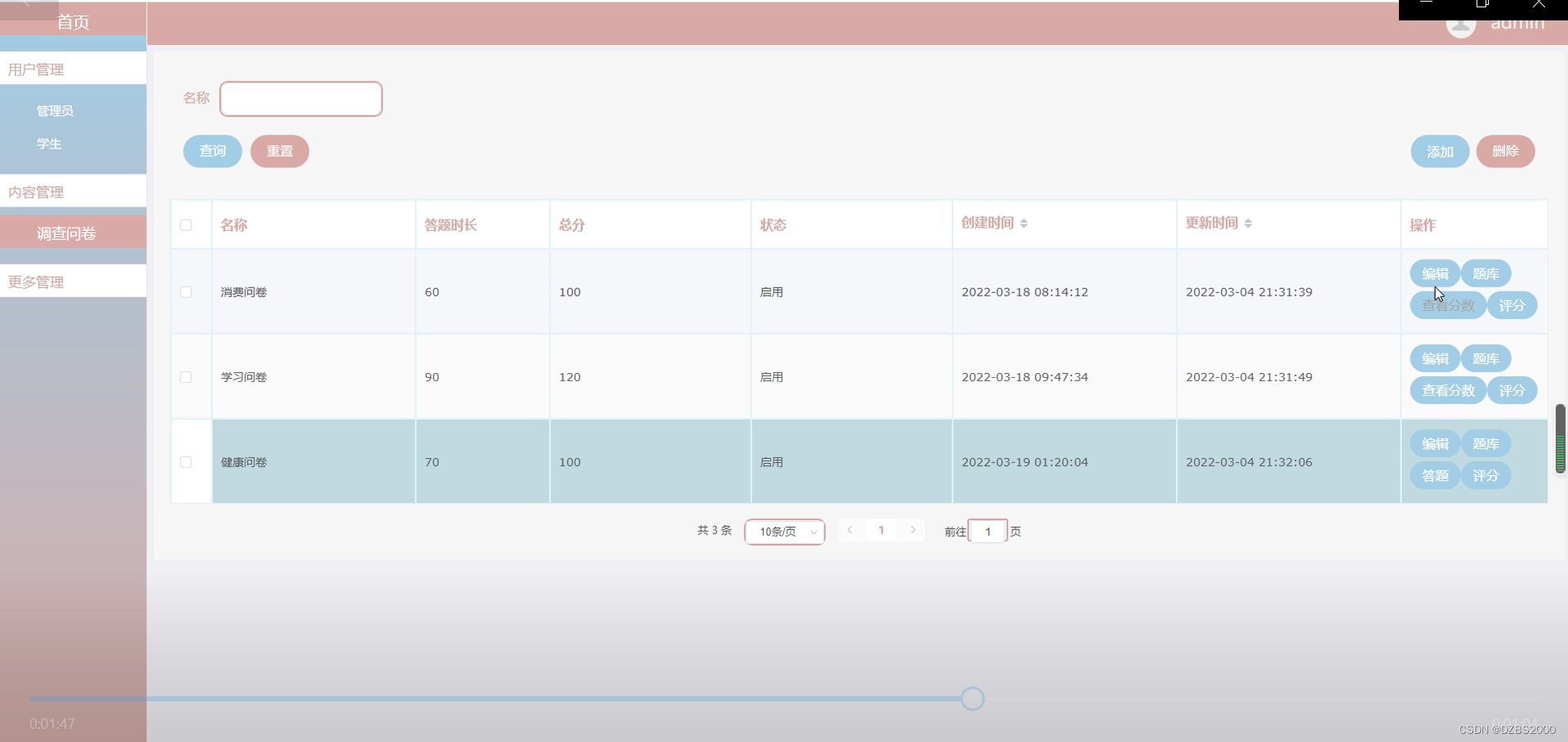 调查问卷功能界面,可查看名称、答题时长、总分、状态、等详情编辑操作,如图5-6所示。