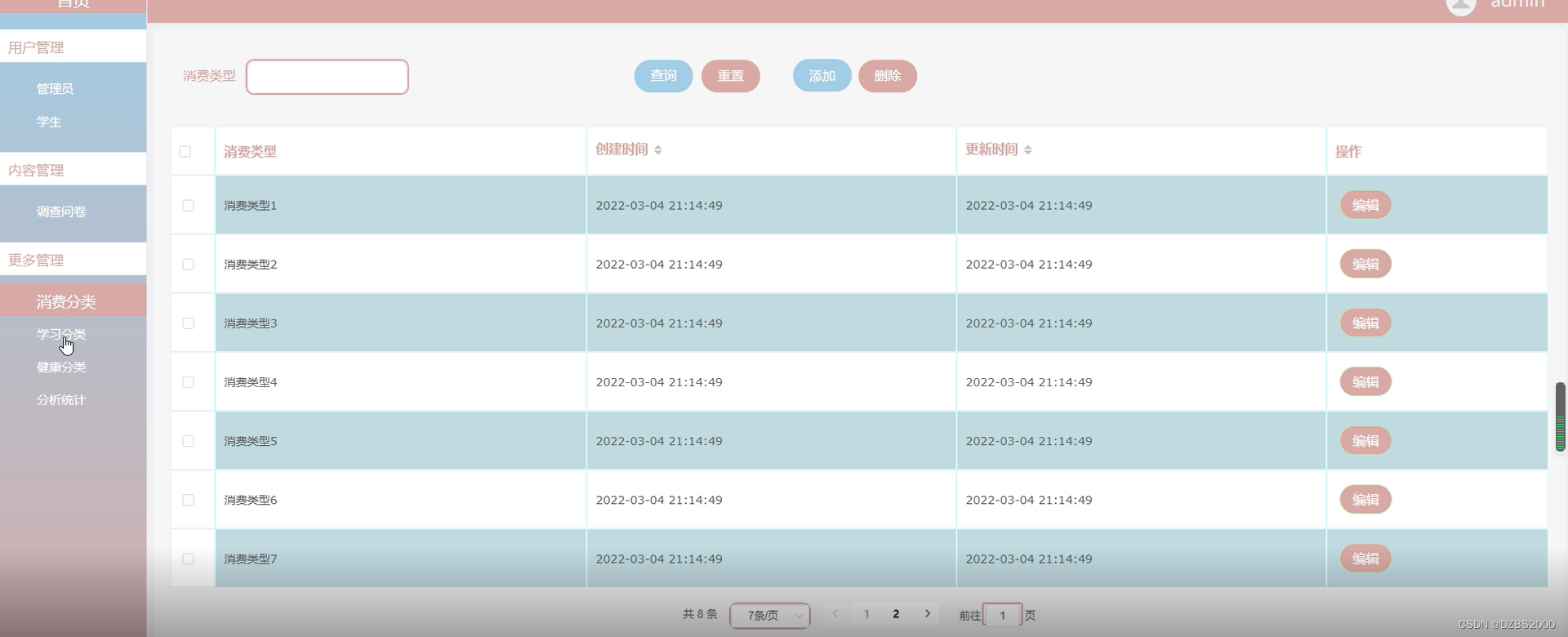 消费分类管理页面可以消费类型、创建时间详情信息等操作。