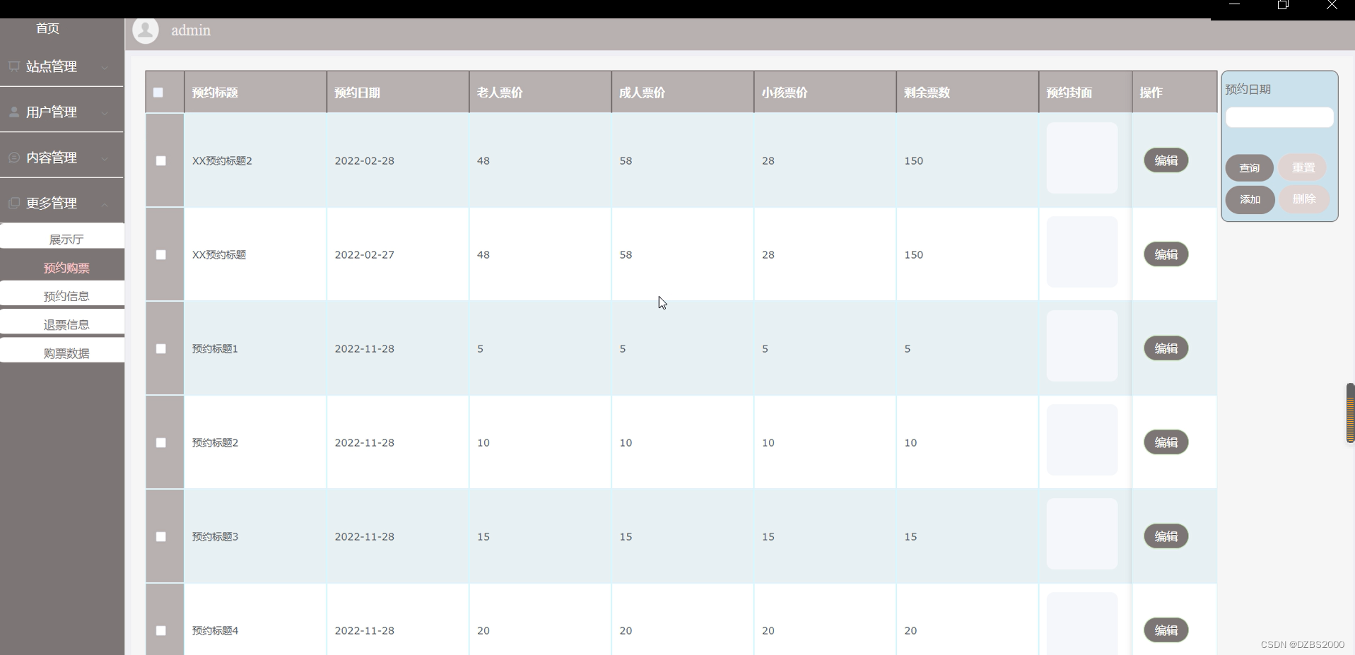 预约购票管理,在预约购票管理查询页面可以查看预约标题、预约日期、老人票价、成人票价、预约封面、小孩票价、预约编号、购票需知操作等内容,并可在该页面进行编辑删除详情等操作,如图5-7所示: