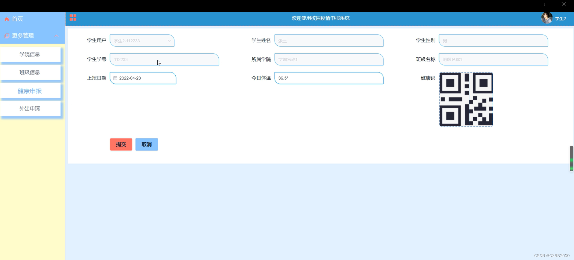 (9)健康申报:学生在后台的“健康申报”界面中可以提交健康申报信息,教师在“健康申报”界面可以进行查看;