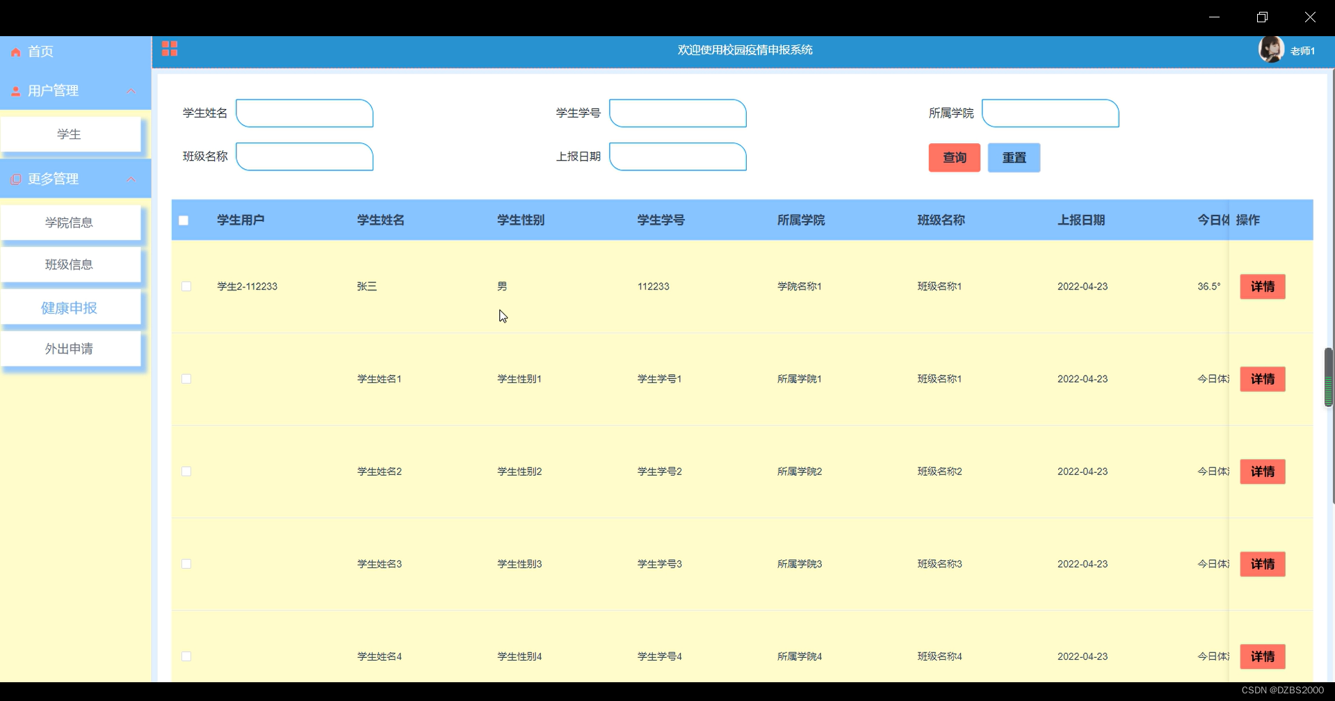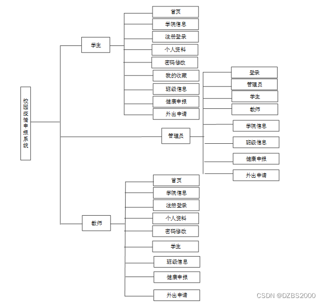 校园疫情申报系统从角色上划分为了学生、教师和管理员三种角色。