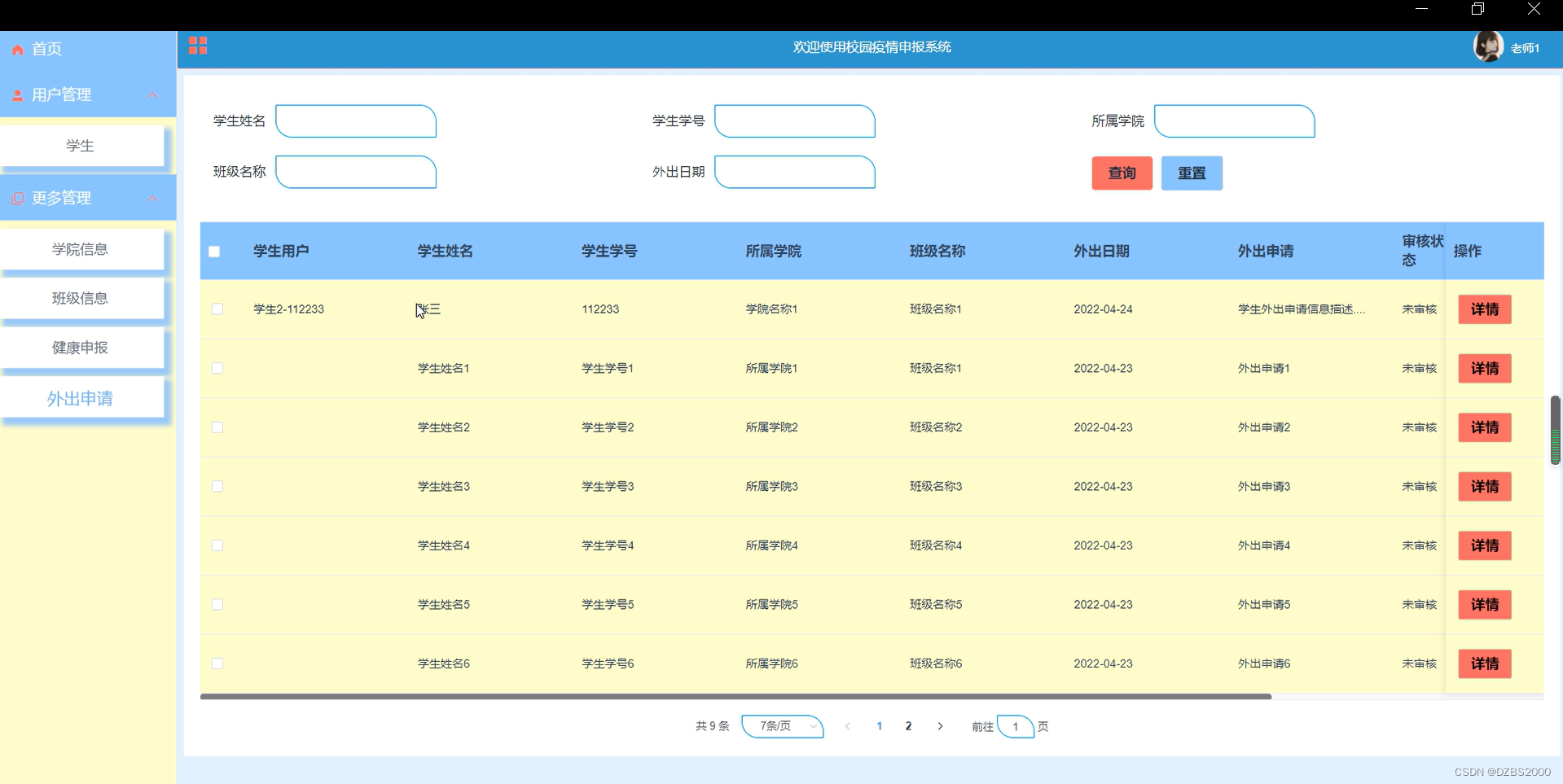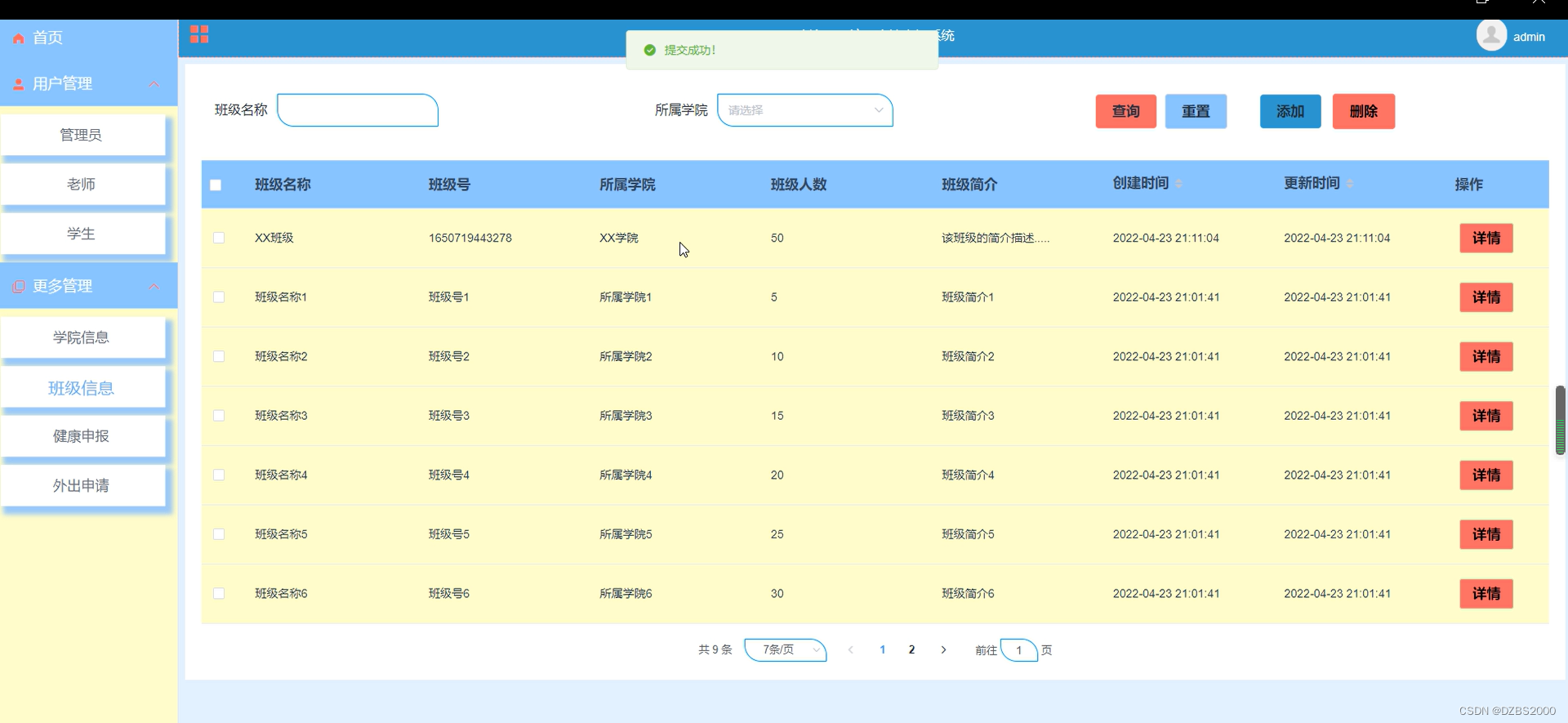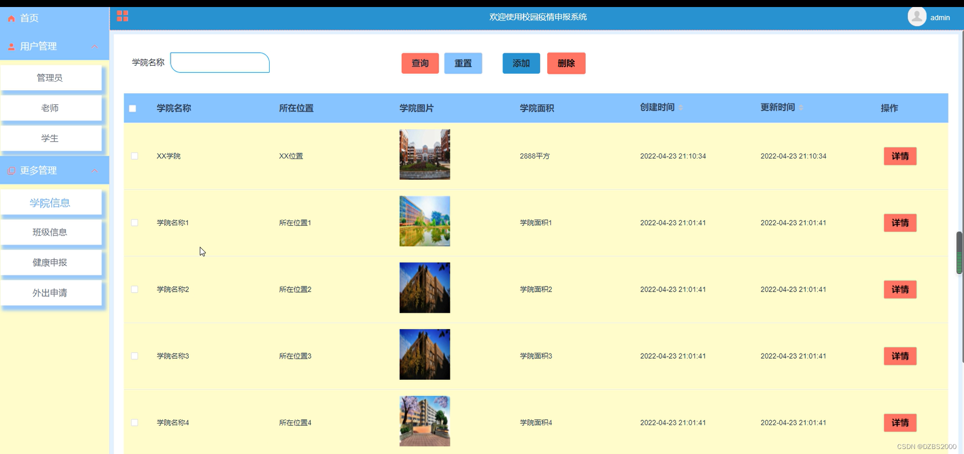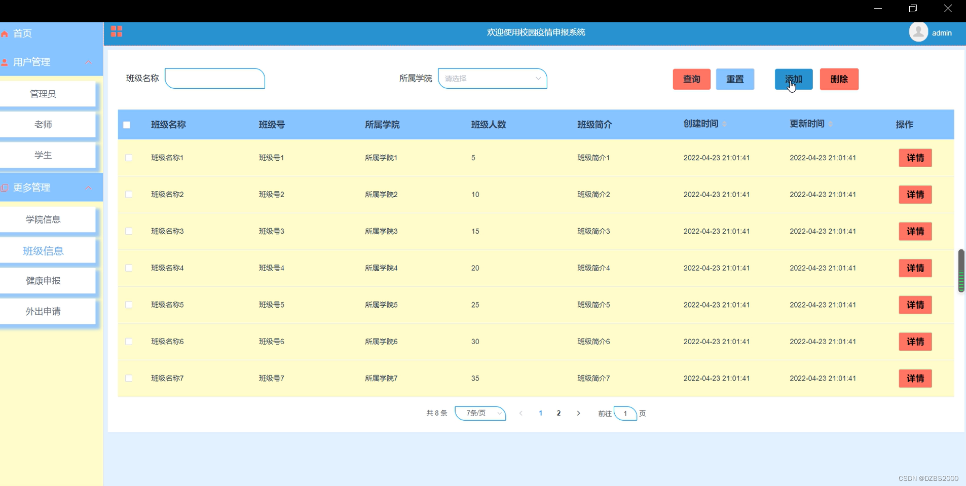 (3)更多管理:当点击“更多”这一菜单的时候,会出现学院信息、班级信息、健康申报、外出申请这四个子菜单,能够对学院信息进行增删改查操作,对学生和教师提交的班级信息进行管控,以及实现对教师和学生提交的健康申报+外出申请进行审核管理;