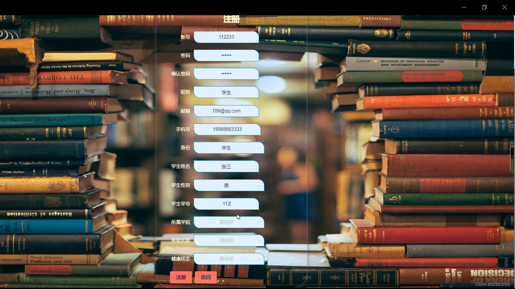 不是校园疫情申报系统中正式会员的是可以在线进行注册的,如果你没有本校园疫情申报系统的账号的话,添加“注册”,当填写上自己的账号+密码+确认密码+昵称+邮箱+手机号等后再点击“注册”按钮后将会先验证输入的有没有空数据,再次验证密码和确认密码是否是一样的,最后验证输入的账户名和数据库表中已经注册的账户名是否重复,只有都验证没问题后即可会员注册成功。注册界面实现了学生+教师两个用户的注册,其用会员注册界面展示如下图4.1所示。