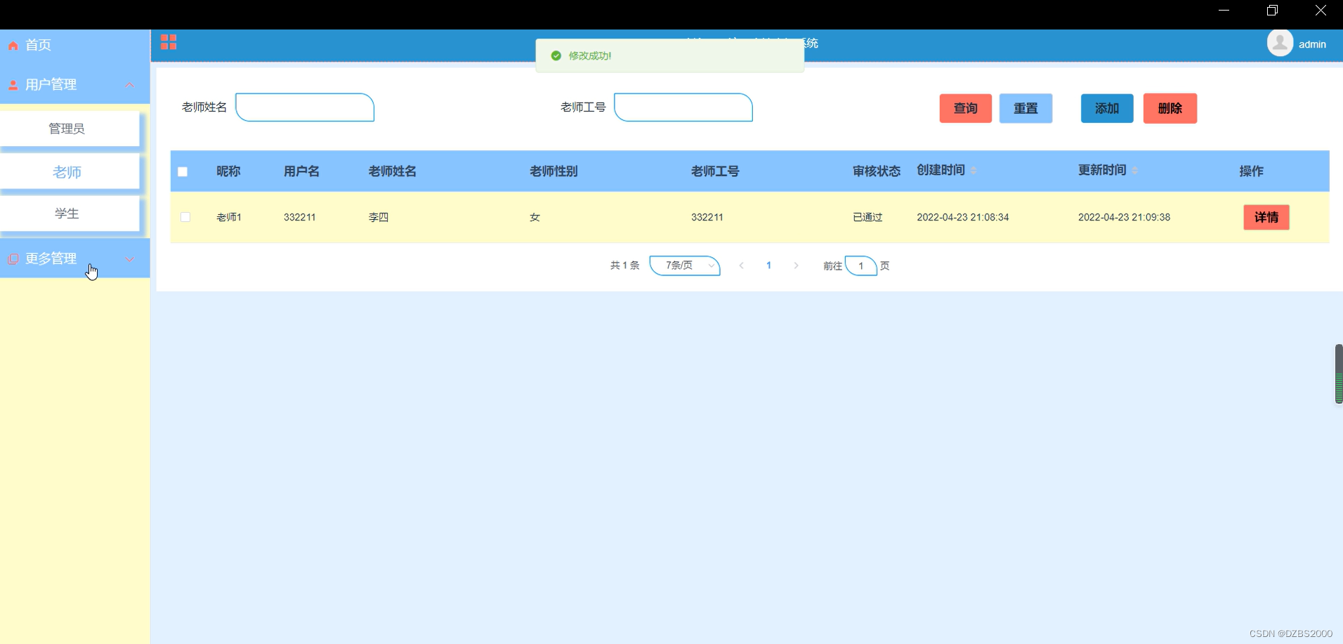 (2)用户管理:当点击“用户管理”这一菜单的时候,会出现管理员+学生+教师三个子菜单,可以对这三个模块进行增删改查操作;