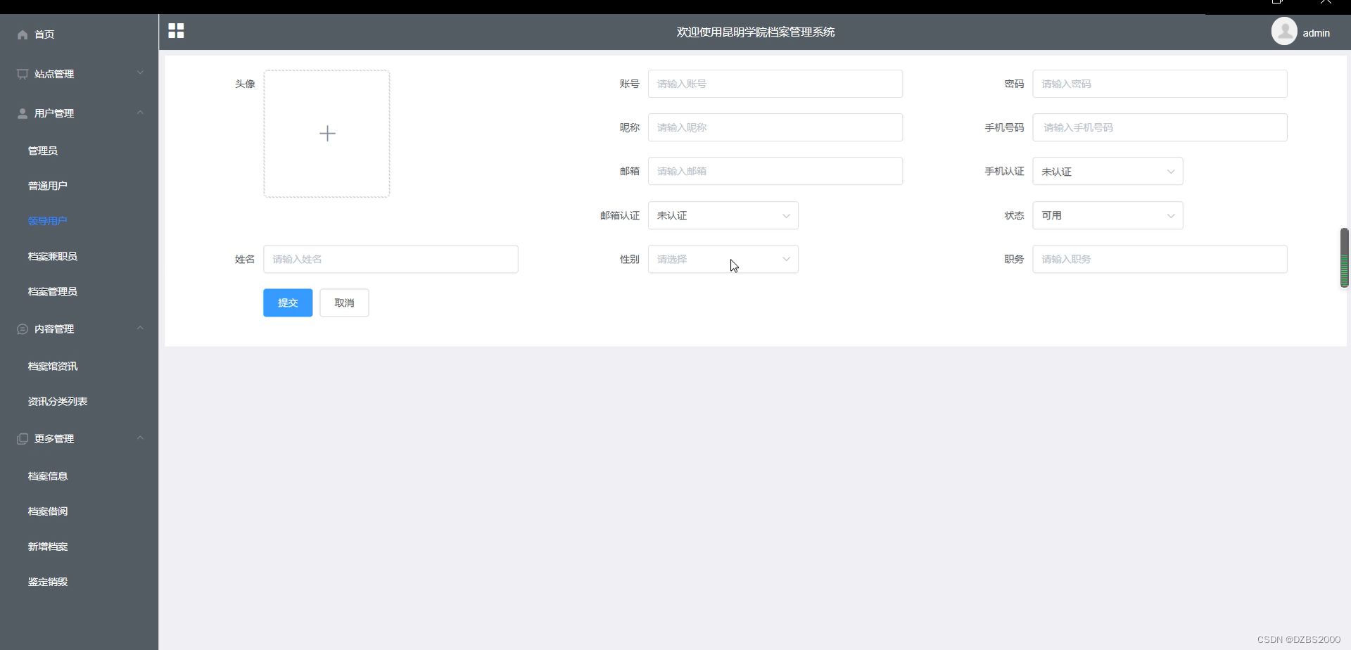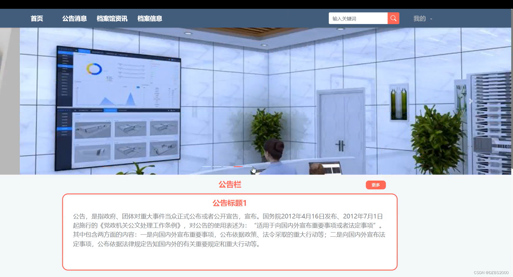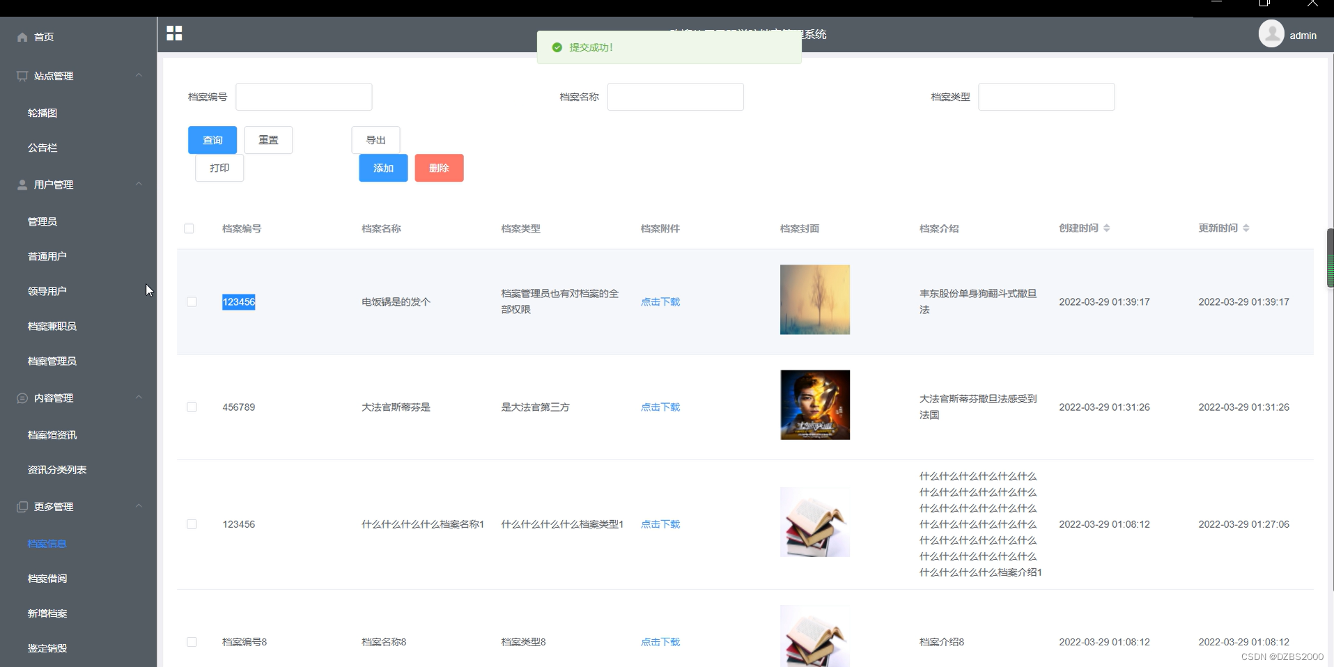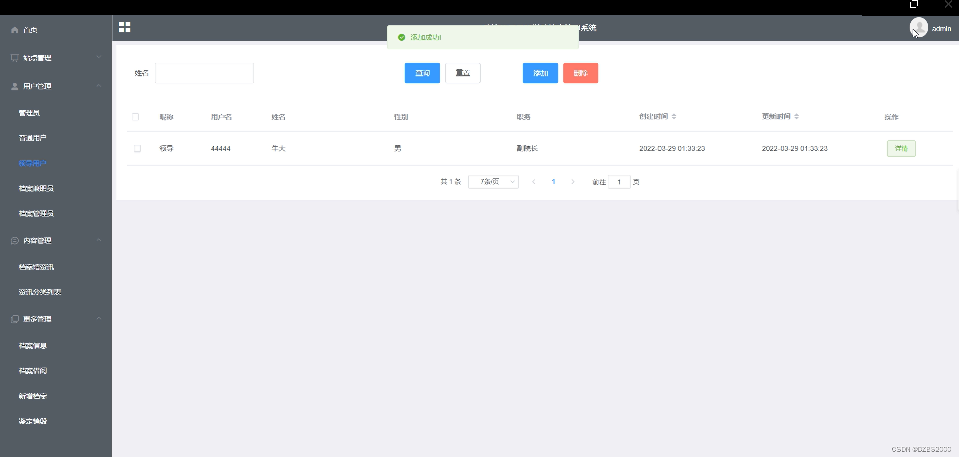 2. 系统功能还不够完善,无法提供丰富多彩的在线功能,只能实现管理员:首页、站点管理(轮播图、公告栏)用户管理(管理员、普通用户、领导用户、档案兼职员、档案管理员)内容管理(档案馆资讯、资讯分类列表)更多管理(档案信息、档案借阅、新增档案、鉴定销毁)管理、系统管理等一系列功能。