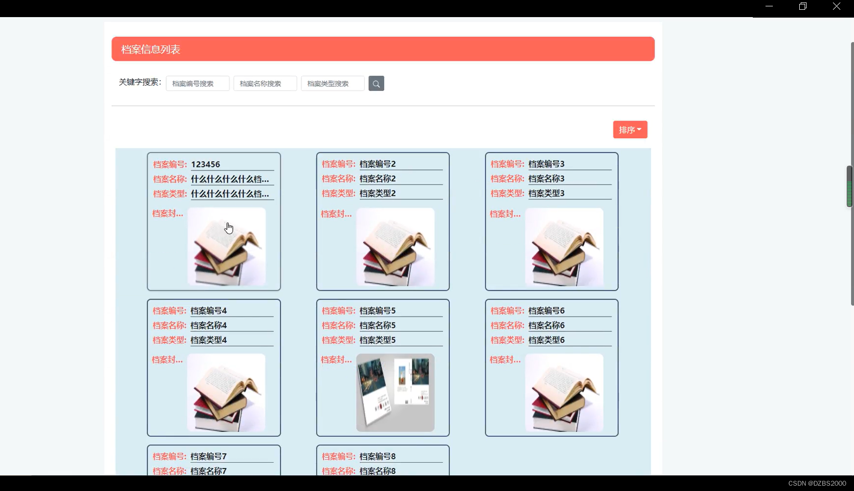 档案信息管理,在档案信息页面可添加档案编号、档案名称、档案类型、档案附件、档案封面、档案介绍等信息,并可根据需要在档案信息查询页面进行修改或删除等操作,如图4-9所示。