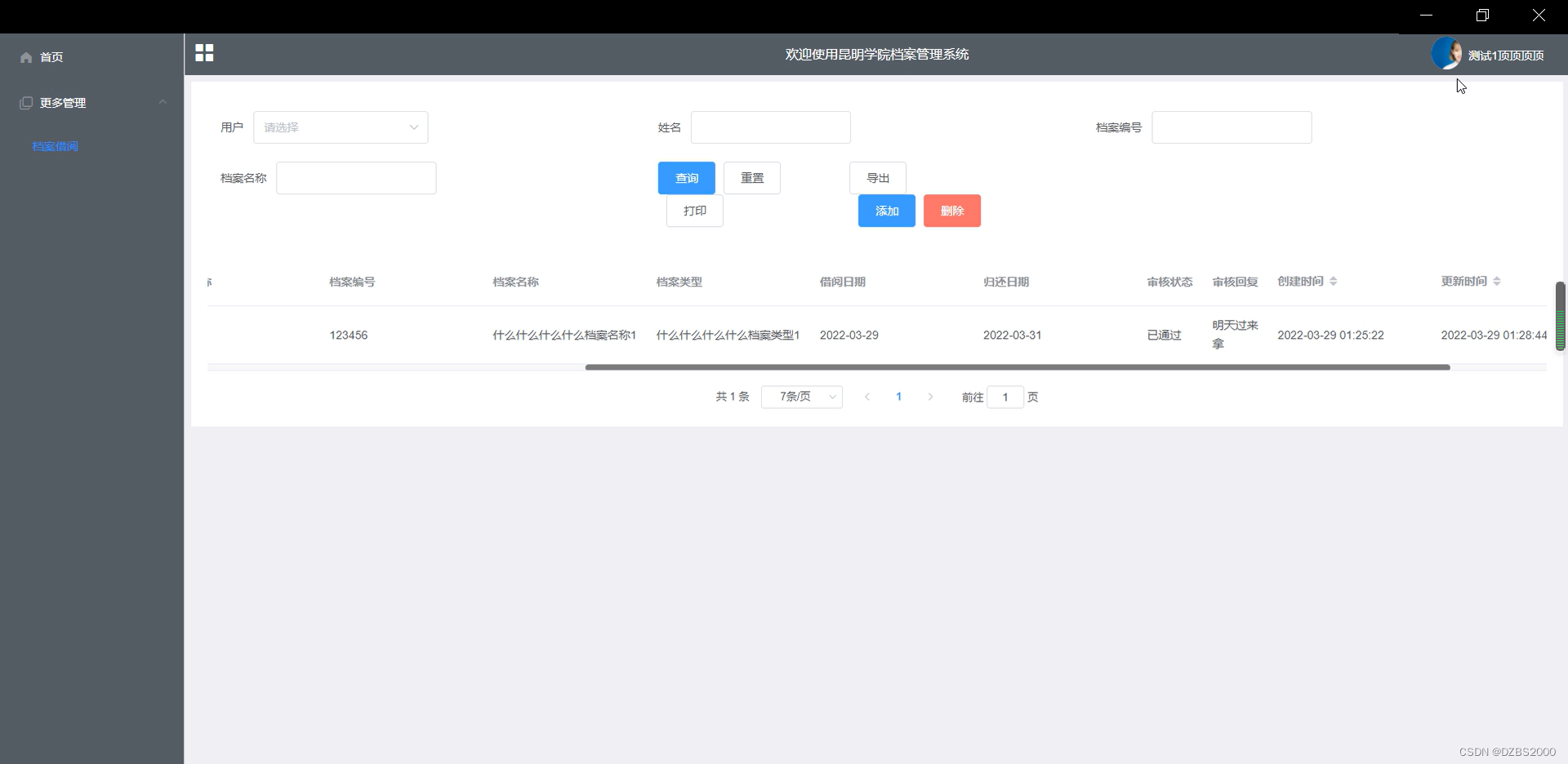 用户进入后台管理界面可查询功能:首页、个人中心、档案借阅管理等功能,如图4-11所示。