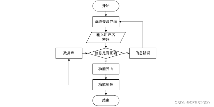 用户打开并进入系统后,会先显示登录界面,输入正确的用户名和密码,系统自动检测信息,若信息无误,则用户会进入系统功能界面,进行操作,否则会提示错误无法登录,操作流程如图3-3所示。