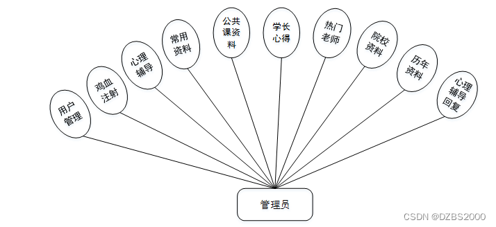 系统中的核心用户是系统管理员,管理员登录后,通过管理员菜单来管理后台系统。主要功能有:首页、站点管理(轮播图、公告栏)用户管理(管理员、用户注册)内容管理(交流平台、交流平台分类、考点资讯、考点资讯分类)更多管理(鸡血注射、心理辅导、常用资料、公共课资料、学长心得、热门老师、院校资料、历年资料、心理辅导回复)等功能。管理员用例如图3-7所示。