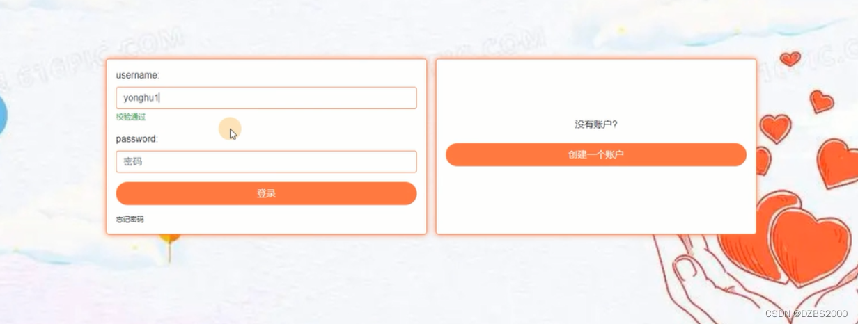 校园爱心捐赠与物品交换平台中的前台上注册后的获赠者是可以通过自己的账户名和密码进行登录的,当会员输入完整的自己的账户名和密码信息并点击“登录”按钮后,将会首先验证输入的有没有空数据,再次验证输入的账户名+密码和数据库中当前保存的用户信息是否一致,只有在一致后将会登录成功并自动跳转到校园爱心捐赠与物品交换平台的首页中;否则将会提示相应错误信息,用户登录界面如下图4-3所示。