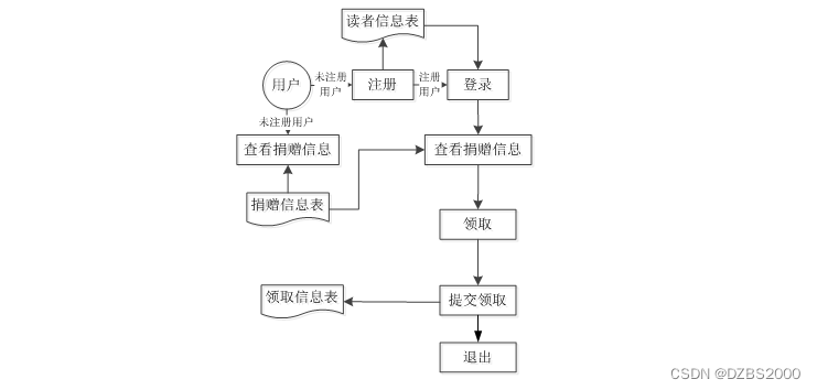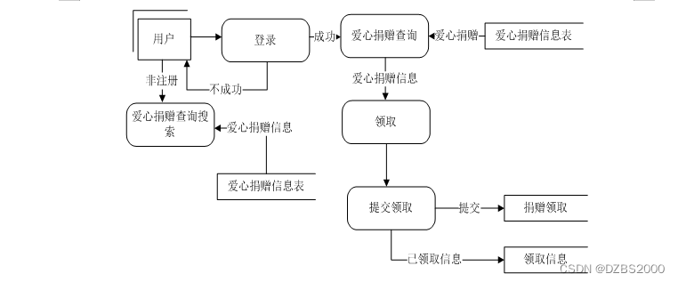 开发校园爱心捐赠与物品交换平台最主要的一个目的就是实现用户对爱心捐赠的领取,图2-4就是系统的数据流图。