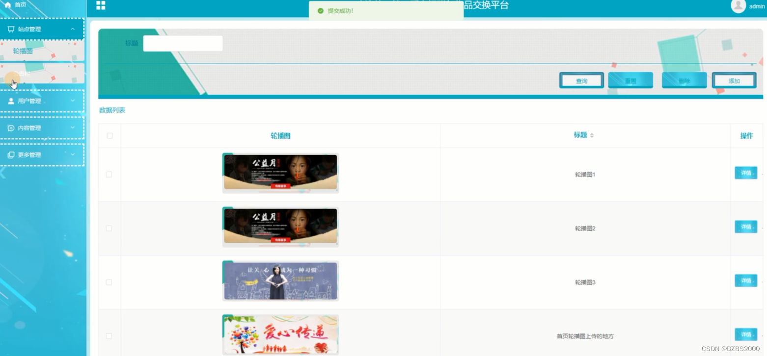 (1)站点管理:管理员可以对系统前台展示的轮播图以及公告进行增伤改查,方便用户进行查看。