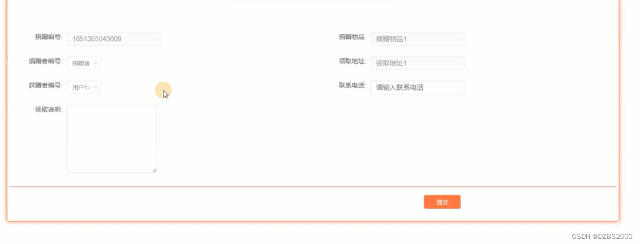 当用户点击左下角的“领取”链接后就进入领取的界面展示,其中的捐赠编号、捐赠物品、捐赠者编号、领取地址、获赠者编号都是自动生成的,用户只要填写联系电话和领取说明,点击“提交”按钮进行提交领取。领取界面如下图4-7所示。