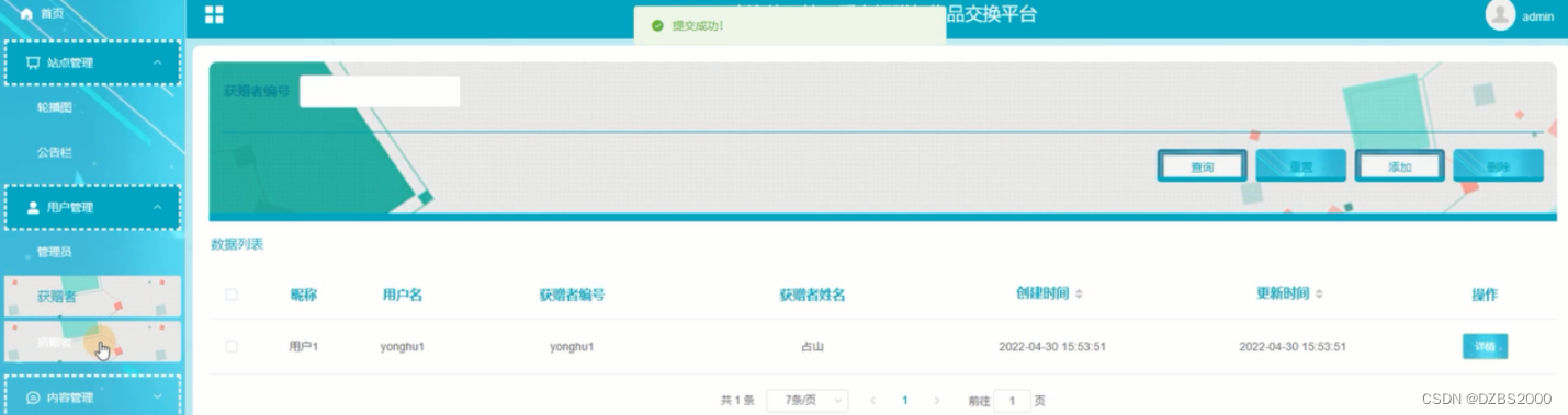 (2)用户管理:管理员可以对校园爱心捐赠与物品交换平台中的管理员,捐赠者以及前台注册的游客获赠者进行增删改查。