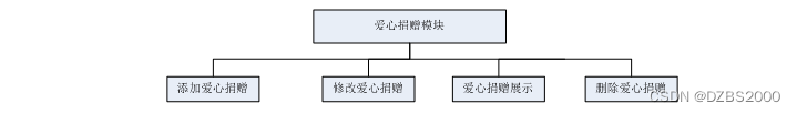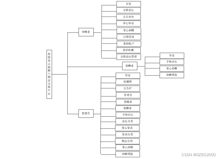 校园爱心捐赠与物品交换平台是中需要存储不少爱心捐赠信息,其模块功能结构,具体的结构图如下:
