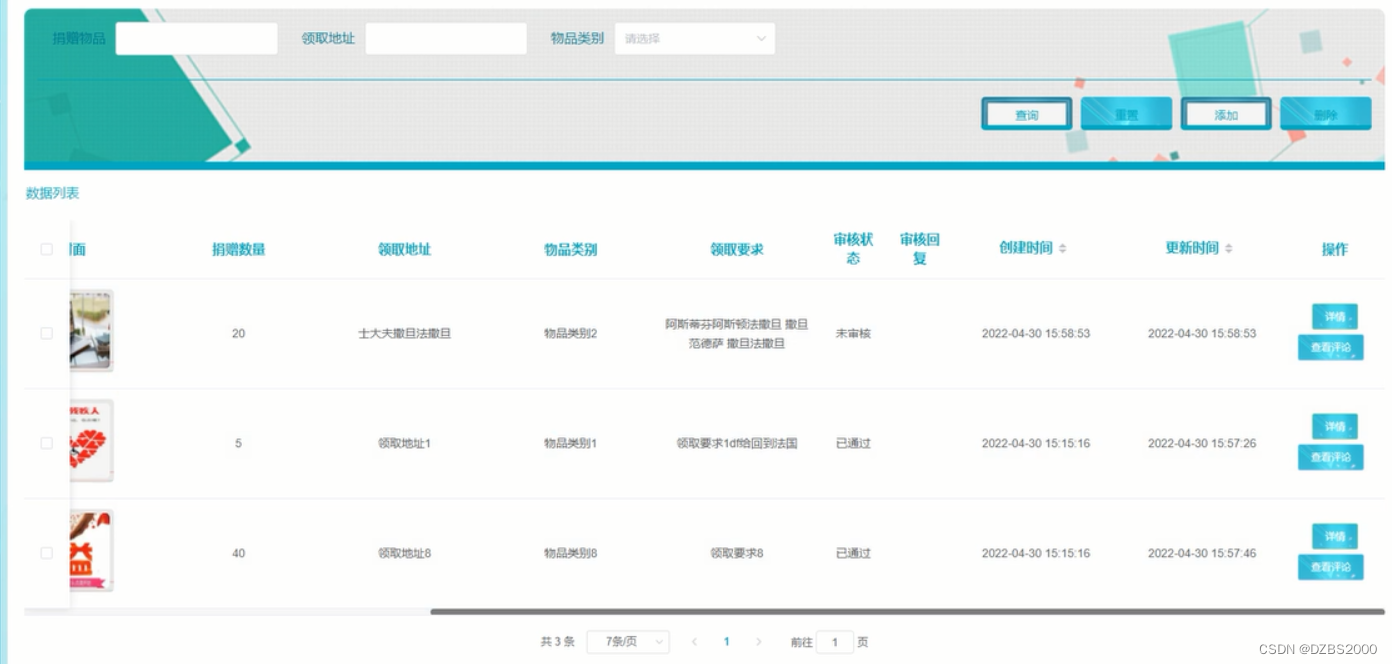 (4)更多管理:在“更多管理”这一菜单下,我们会看到物品分类、爱心捐赠、捐赠领取,管理员可以对其进行增删改查操作。