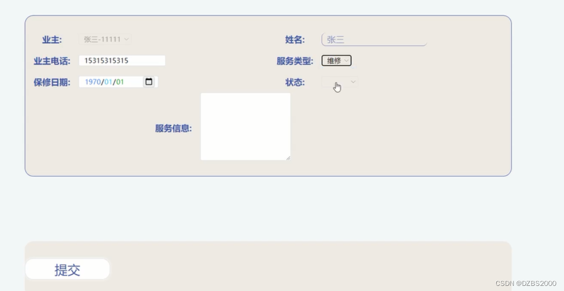 (3)社区服务:当业主登录到系统中以后,点击“社区服装”这一菜单,系统会自动生成业主、姓名、报修日期,业主只需要填写好电话、服务类型、状态、服务信息,点击提交就可以了;