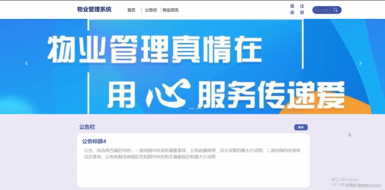(1)系统信息:当业主进入本物业管理系统的前台的时候,首先展示在眼前的是导航栏、轮播图、公告栏等信息,业主可以根据自己个人的需求进行查看;