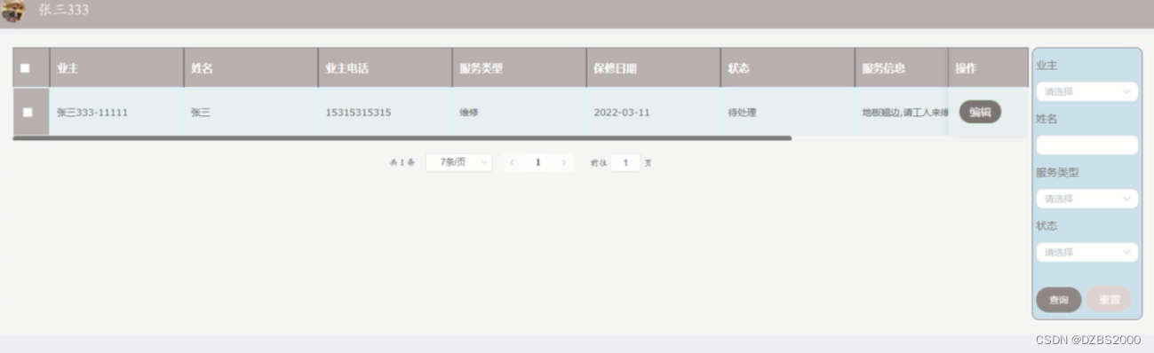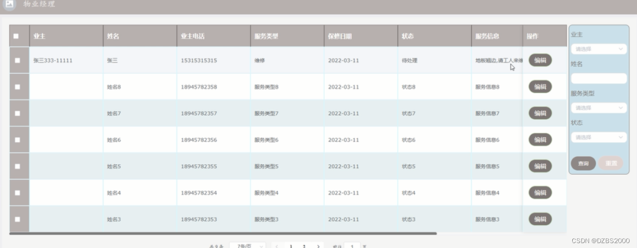 (4)社区服务:管理员、物业经理、物业员工点击“社区服务”这一按钮后会显示出前台业主提交的物业服务信息,任选一条物业服务信息,点击“编辑”这一按钮后,会对物业服务的状态进行设置,如果已经处理,可以设置成已处理,没有完成处理的话,可以设置成为待处理;