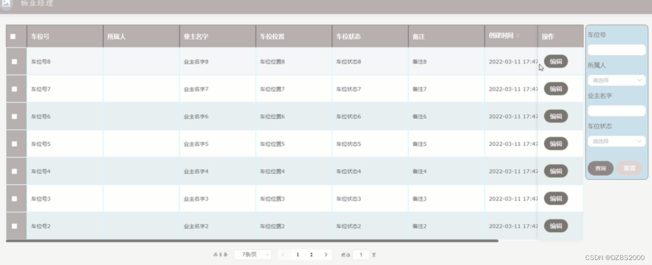 (6)车位信息:点击“车位信息”这一按钮后会显示出所有的车位信息,并且可以进行添加、编辑、删除和查询操作,对车位的所有人进行设置;
