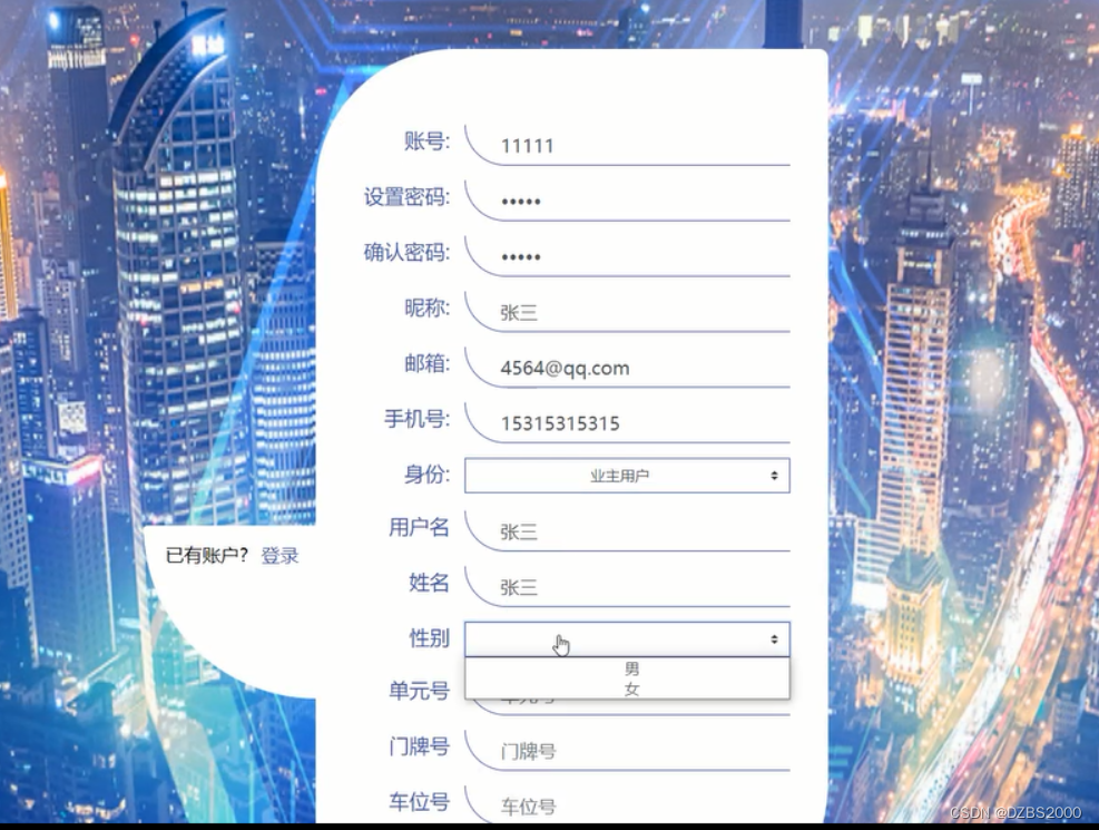 不是物业管理系统中业主的是可以在线进行注册的,当用户点击右上角“注册”按钮的时候,当填写上自己的账号+密码+确认密码+昵称+邮箱+手机号后等信息再点击“注册”按钮后将会先验证输入的有没有空数据,再次验证密码和确认密码是否是一样的,最后验证输入的账户名和数据库表中已经注册的账户名是否重复,只有都验证没问题后即可业主注册成功。其用业主注册界面展示如下图4.2所示。