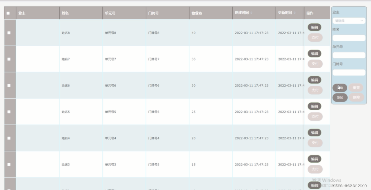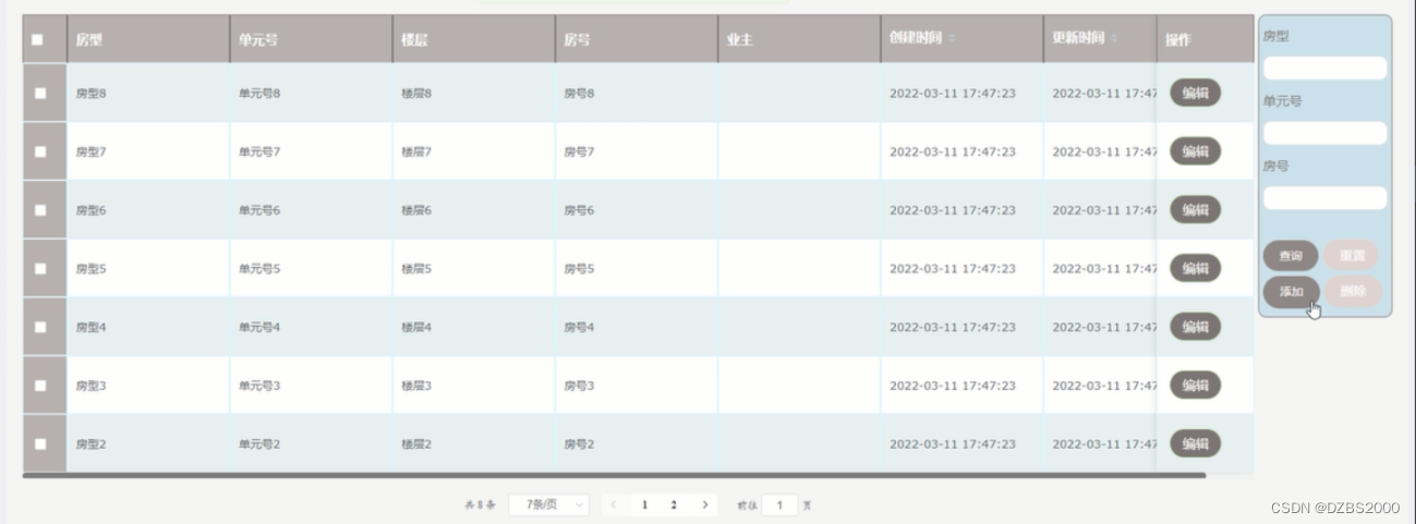 (5)房产信息:点击“房产信息”这一按钮后会显示出所有的房产信息,并且可以进行添加、编辑、删除和查询操作;