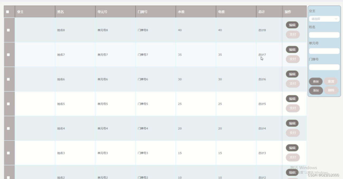 (10)水电费缴纳:点击“水电费缴纳”这一按钮后会显示出所有的水电费缴纳信息,并且支持增删改查操作,也可以点击“支付”进行支付;