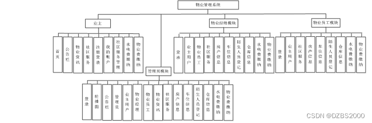 系统的整体架构确定以后,再来看物业管理系统的主要功能模块图。整体的功能模块包括管理员+物业经理+物业员工+业主三个模块,实现的模块主要有用户管理、社区服务、房产信息、车位信息、陌生人员登记、仓库信息、水电费缴纳、物业费缴纳等。
