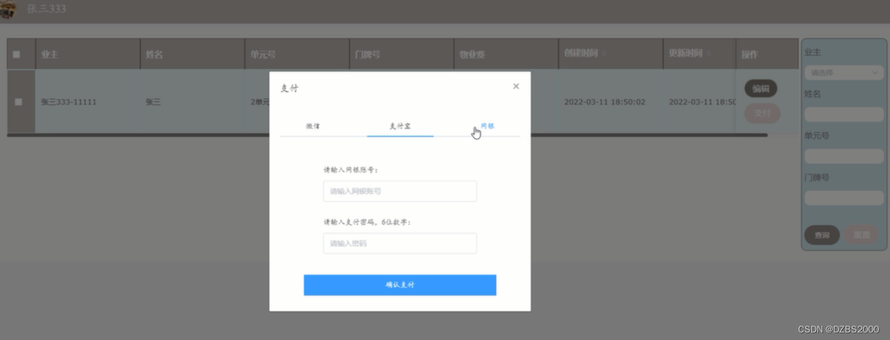 当业主在后台点击 “物业费缴纳”这个按钮,会出现自己的物业费信息,点击“支付”按钮,选择支付方式进行缴纳,物业费缴纳界面如下图4.9所示。