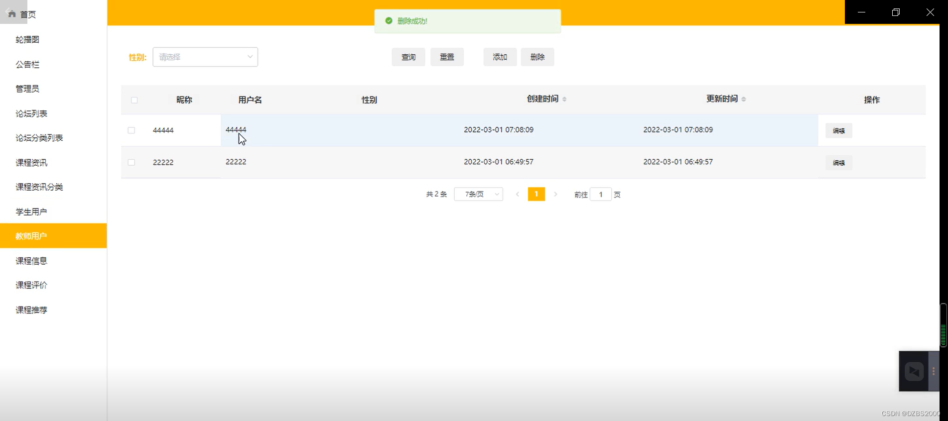 教师管理,在教师管理页面中对教师进行添加:昵称、用户名、性别等内容,还可在教师查询页面对已有的教师信息进行编辑删除详情等操作,如图5-5所示: