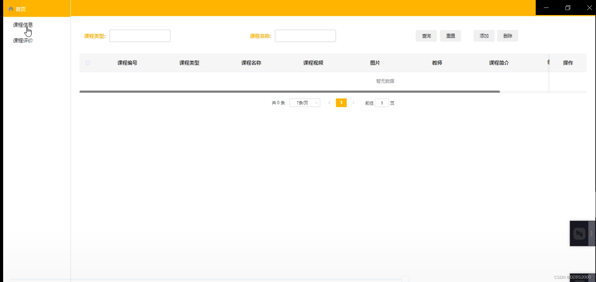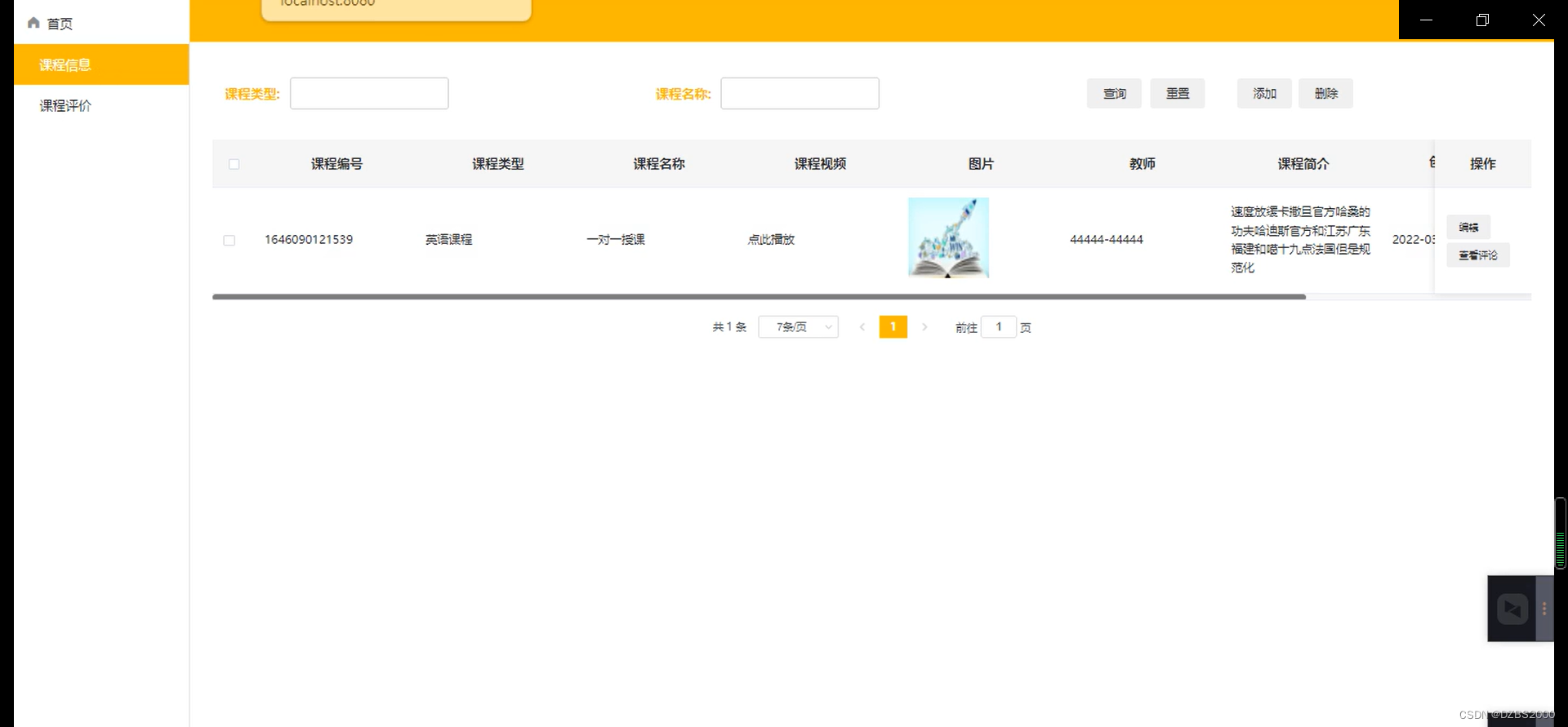 课程管理,在课程管理页面图中可以添加课程内容:课程类型、课程编号、课程名称、课程视频、图片、教师、课程简介等内容,还可在课程管理查询页面对已有的课程进行评价,编辑删除详情等操作 如图5-6
