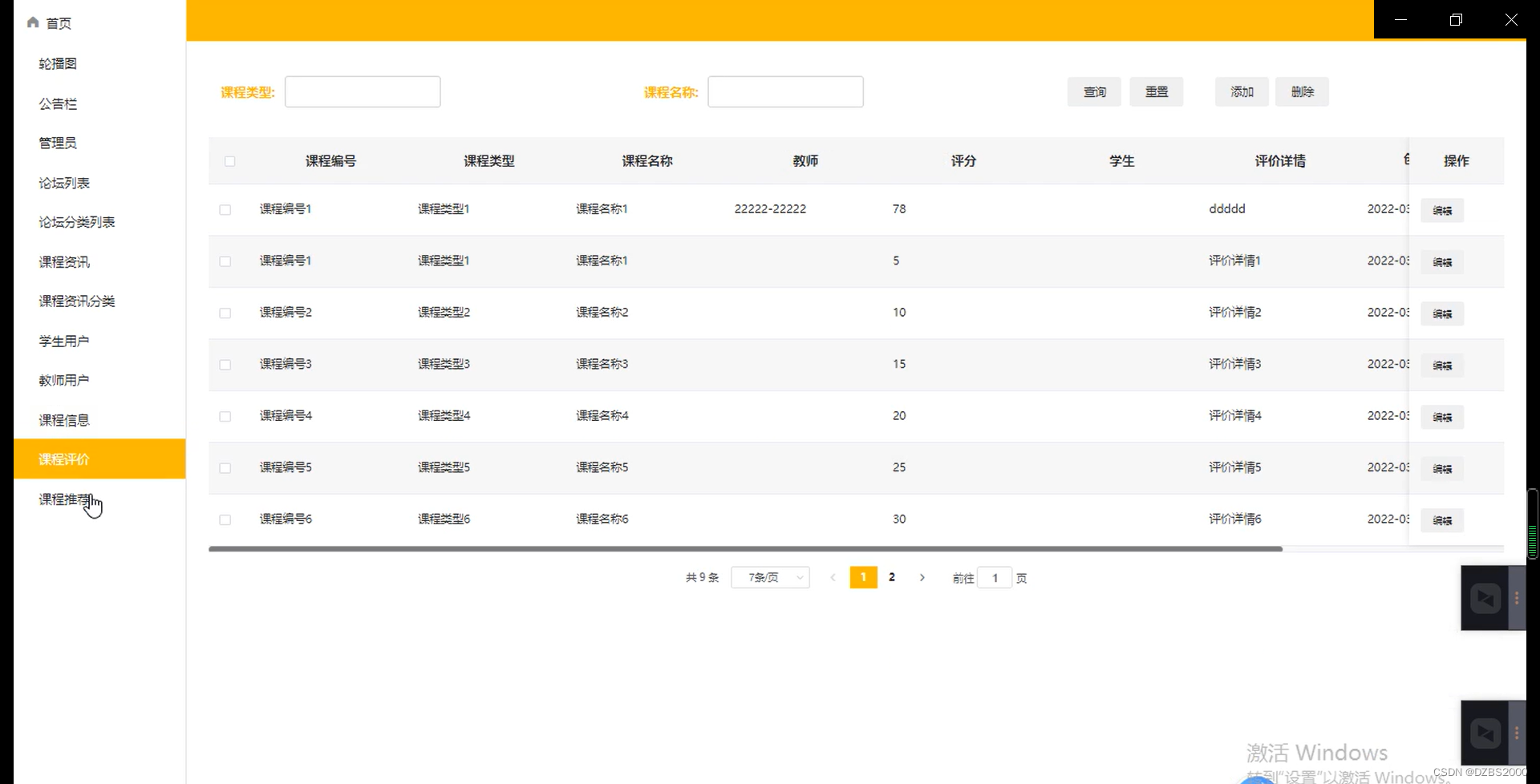 课程评价管理,在课程评价管理页面列表可查询评价信息:课程编号、课程名称、教师工号、教师姓名、评分、评价详情、添加时间等内容,还可在该页面进行编辑删除详细等操作,如5-8