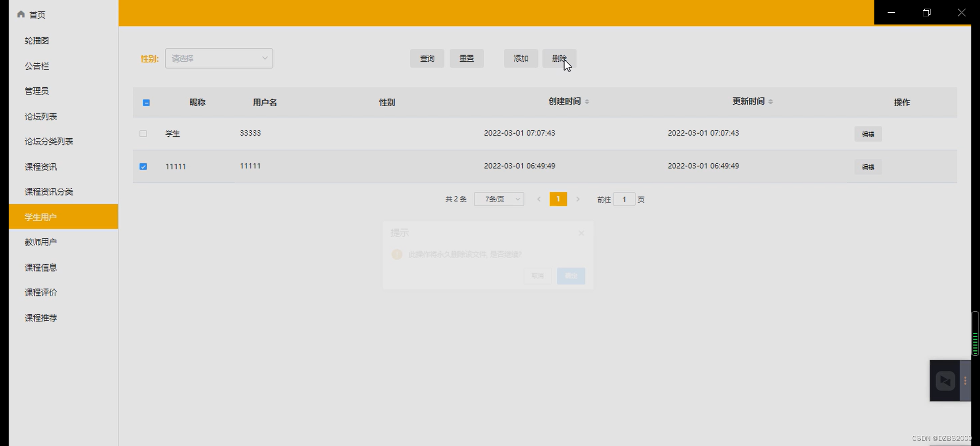 学生管理,在学生管理界面图可添加学生信息内容:昵称、用户名、性别等信息,并可在学生管理查询页面进行编辑删除详情等操作,如图5-4
