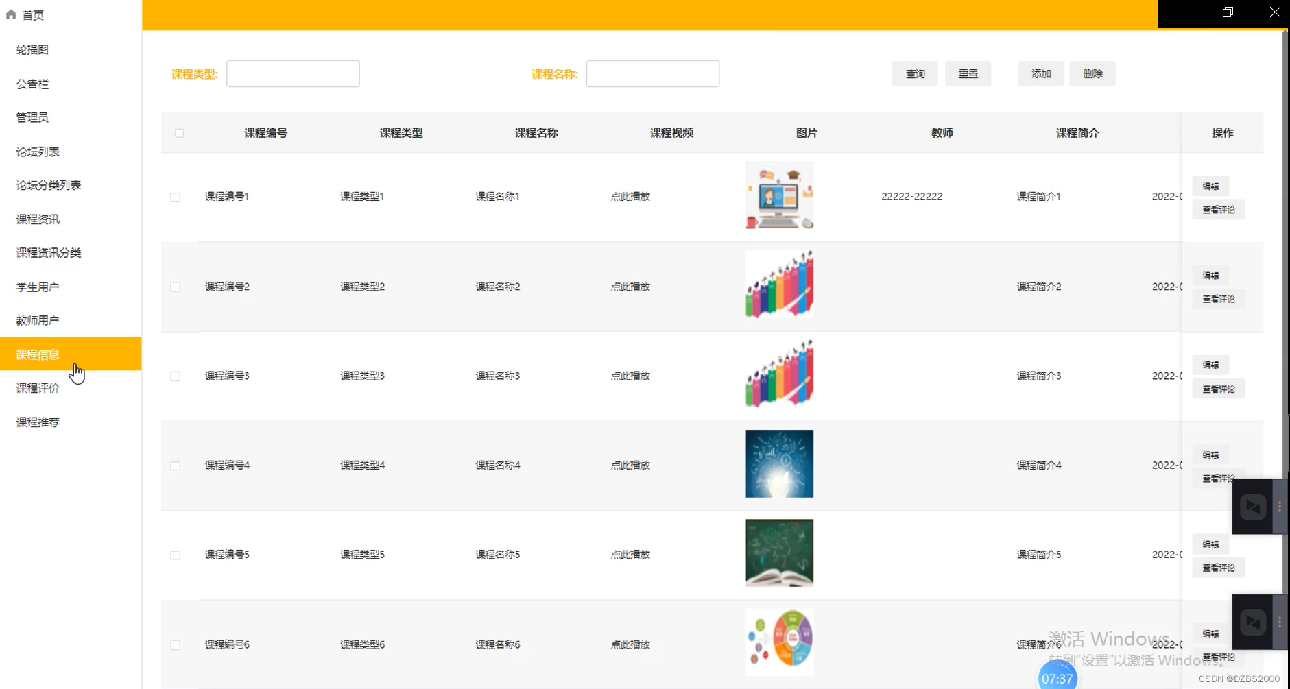 课程管理,在课程管理页面图中可以添加课程内容:课程类型、课程编号、课程名称、课程视频、图片、教师、课程简介等内容,还可在课程管理查询页面已有的课程,修改、编辑、删除详情等操作。