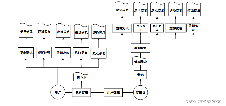 业务流程图不仅能反映出内部业务之间的关系,而且能体现出作业顺序及信息的流动。城市旅游景点信息交流平台必须支持整个组织在不同层次上的各种功能,各个功能模块之间又有各种不同相关的信息进行联系,构成了一个有机的整体,根据景点攻略推荐网站的特点以及结合所面临的实际情况,设计出了系统的业务流程图。