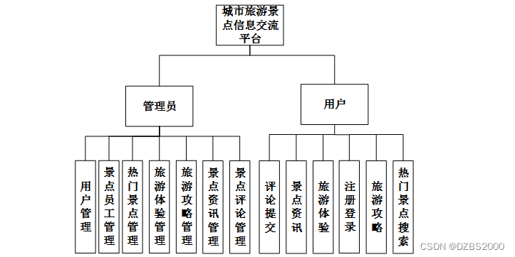 根据对系统的功能进行分析可以总结城市旅游景点信息交流平台的具体功能模块包括下面的几个主要的功能模块:该系统主要从两大模块进行设计的,首先就是用户参与操作需要的模块,此外还需要有管理员用到的模块,两者之间不是互相独立的,他们之间有着密切的联系,同数据库表中的数据连接起来进行操作。每个模块访问相同的数据库,但访问的表不同。系统的各个功能模块是根据所收集的资料研究得到的。在以上分析功能的基础上,系统模块分为多个模块。用户含有的功能有注册,登录,景点信息列表,收藏、热门景点信息、旅游攻略搜索、景点评论提交等,退出登录等功能,管理员含有的功能有修改密码,用户管理、景点员工管理、旅游攻略管理、旅游体验管理、评论管理等功能。