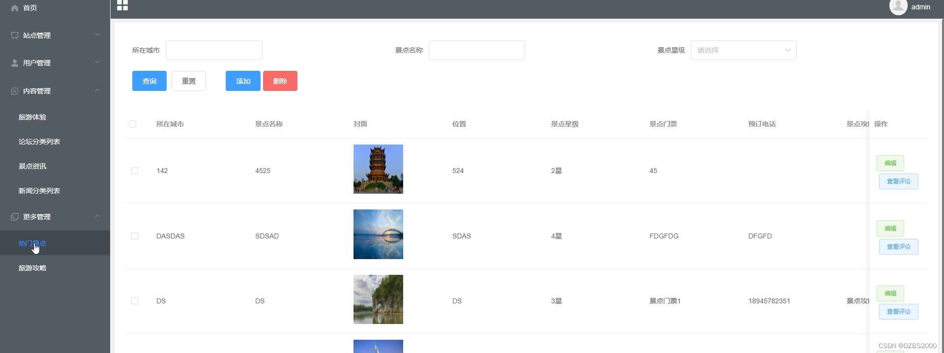 热门景点管理模块:管理员发布热门景点,并且添加热门景点数据,也能够删除热门景点数据。