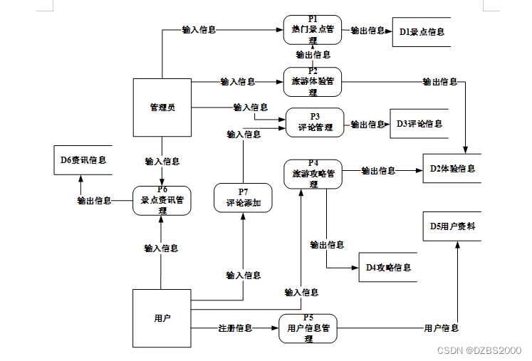 根据系统的业务流程,用户浏览所使用到的数据归纳为输出信息。而用户提交的数据则作为系统的输入数据。相应的,根据系统管理员业务流程,管理员对系统内容的添加、更新和删除等所操作的数据定义为输入信息。