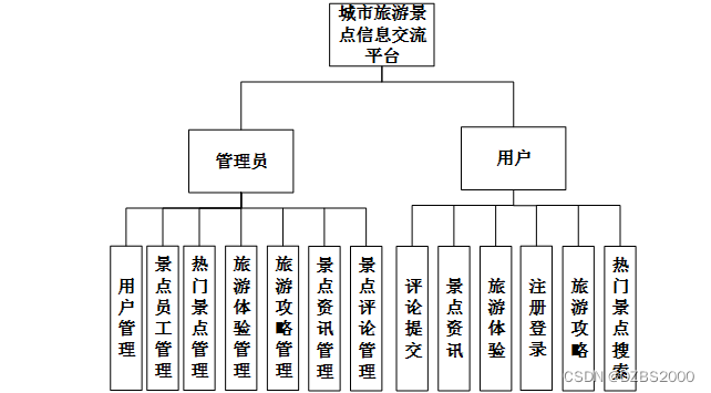 根据对系统的功能进行分析可以总结城市旅游景点信息交流平台的具体功能模块包括下面的几个主要的功能模块:该系统主要从两大模块进行设计的,首先就是用户参与操作需要的模块,此外还需要有管理员用到的模块,两者之间不是互相独立的,他们之间有着密切的联系,同数据库表中的数据连接起来进行操作。每个模块访问相同的数据库,但访问的表不同。系统的各个功能模块是根据所收集的资料研究得到的。在以上分析功能的基础上,系统模块分为多个模块。用户含有的功能有注册,登录,景点信息列表,收藏、热门景点信息、旅游攻略搜索、景点评论提交等,退出登录等功能,管理员含有的功能有修改密码,用户管理、景点员工管理、旅游攻略管理、旅游体验管理、评论管理等功能。