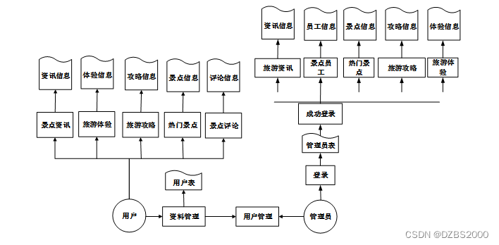 业务流程图不仅能反映出内部业务之间的关系,而且能体现出作业顺序及信息的流动。城市旅游景点信息交流平台必须支持整个组织在不同层次上的各种功能,各个功能模块之间又有各种不同相关的信息进行联系,构成了一个有机的整体,根据景点攻略推荐网站的特点以及结合所面临的实际情况,设计出了系统的业务流程图。