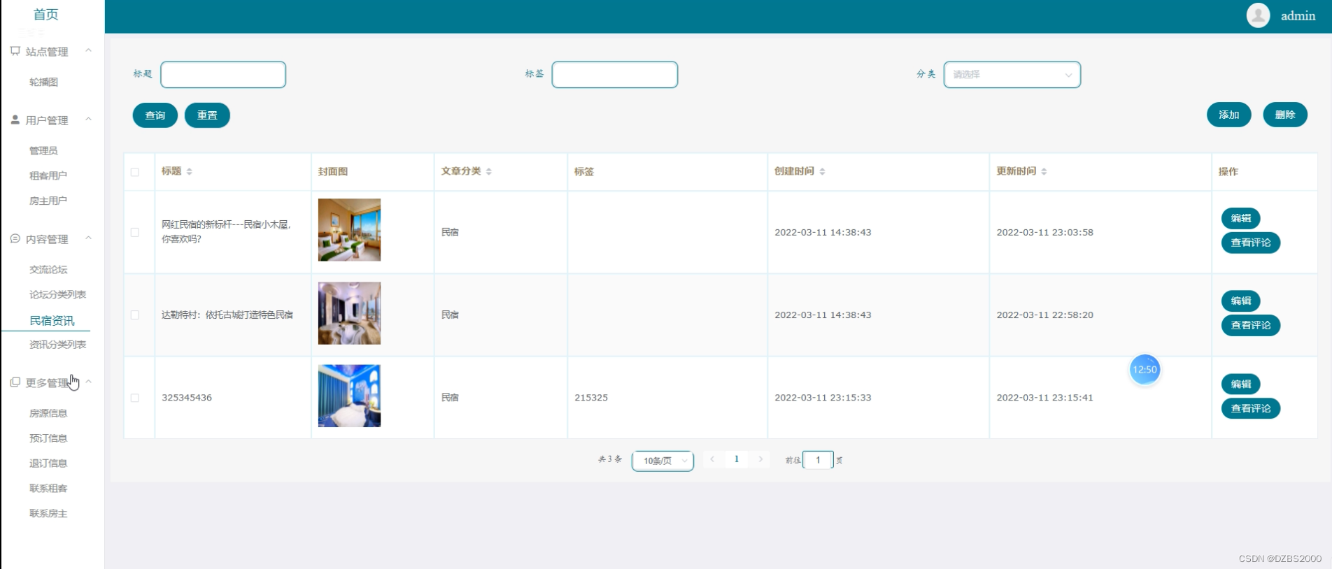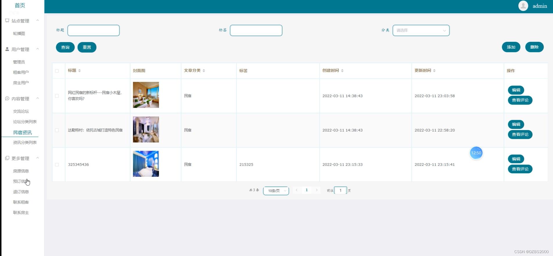 民宿资讯管理,在民宿资讯管理页面中可以添加民宿资讯信息:标题、封面图、文章分类、标签等内容,并可根据需要在民宿资讯查询页面对民宿资讯信息进行修改或删除详细还有查看评论等操作,如图5-13所示。