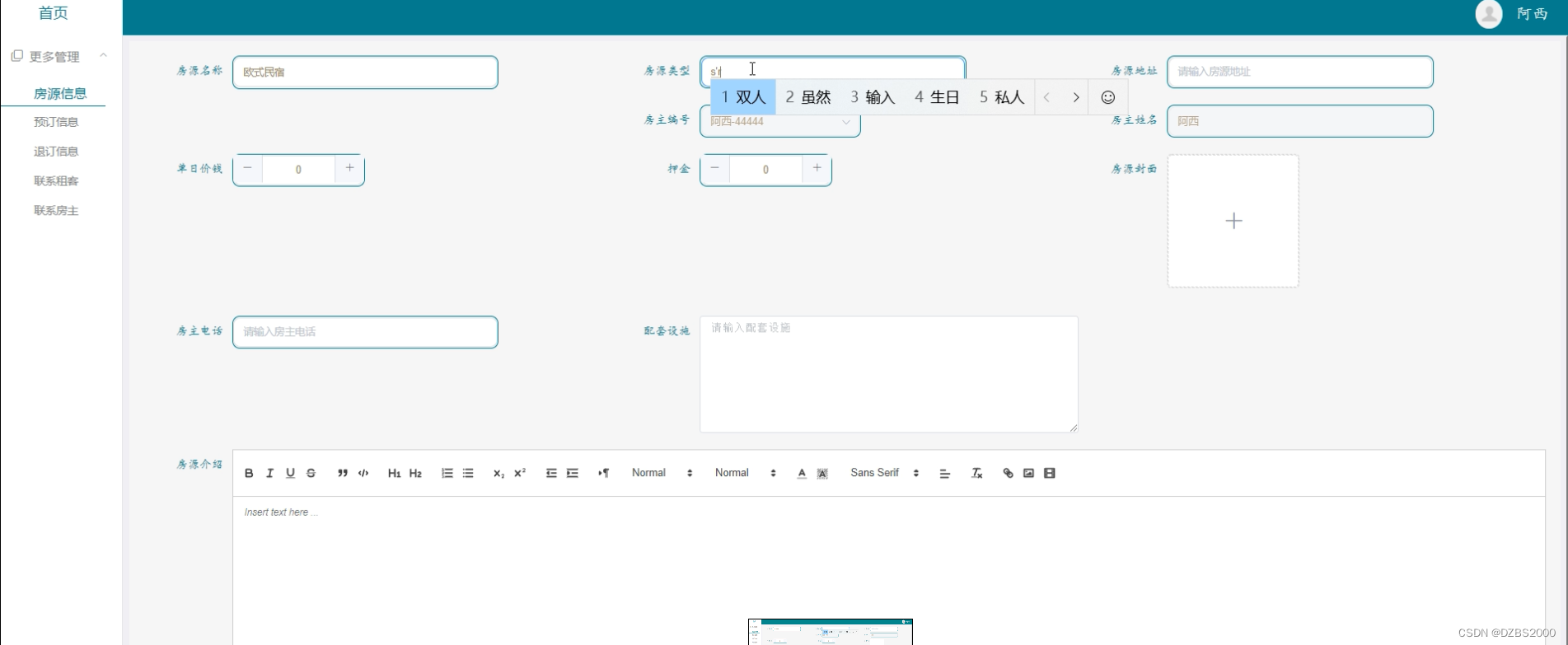 民宿预订系统统主要功能模块包括用户管理、房源信息、预订信息、退订信息、联系租客、联系房主,采取面对对象的开发模式进行软件的开发和硬体的架设,能很好的满足实际使用的需求,完善了对应的软体架设以及程序编码的工作,采取MySQL作为后台数据的主要存储单元,采用JavaEE框架、Java技术、Ajax技术进行业务系统的编码及其开发,实现了本系统的全部功能。本次报告,首先分析了研究的背景、作用、意义,为研究工作的合理性打下了基础。针对民宿预订系统统的各项需求以及技术问题进行分析,证明了系统的必要性和技术可行性,然后对设计系统需要使用的技术软件以及设计思想做了基本的介绍,最后来实现民宿预订系统统和部署运行使用它。