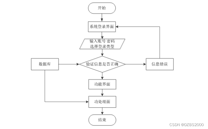 用户想进入系统,首先进入系统登录界面,通过正确的用户名、密码,选择登录类型登录,系统会检查登录信息,信息正确,然后输入相应的功能界面,提示信息错误,登录失败。系统操作流程如图3-4所示。