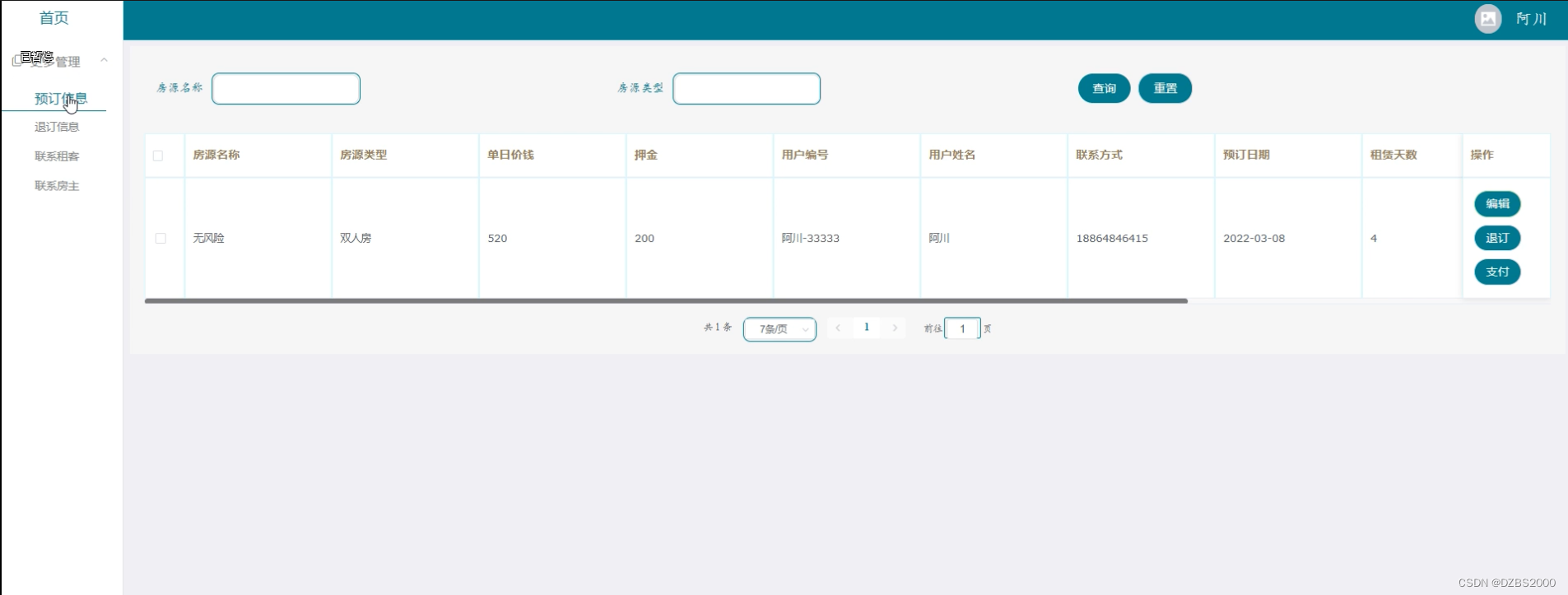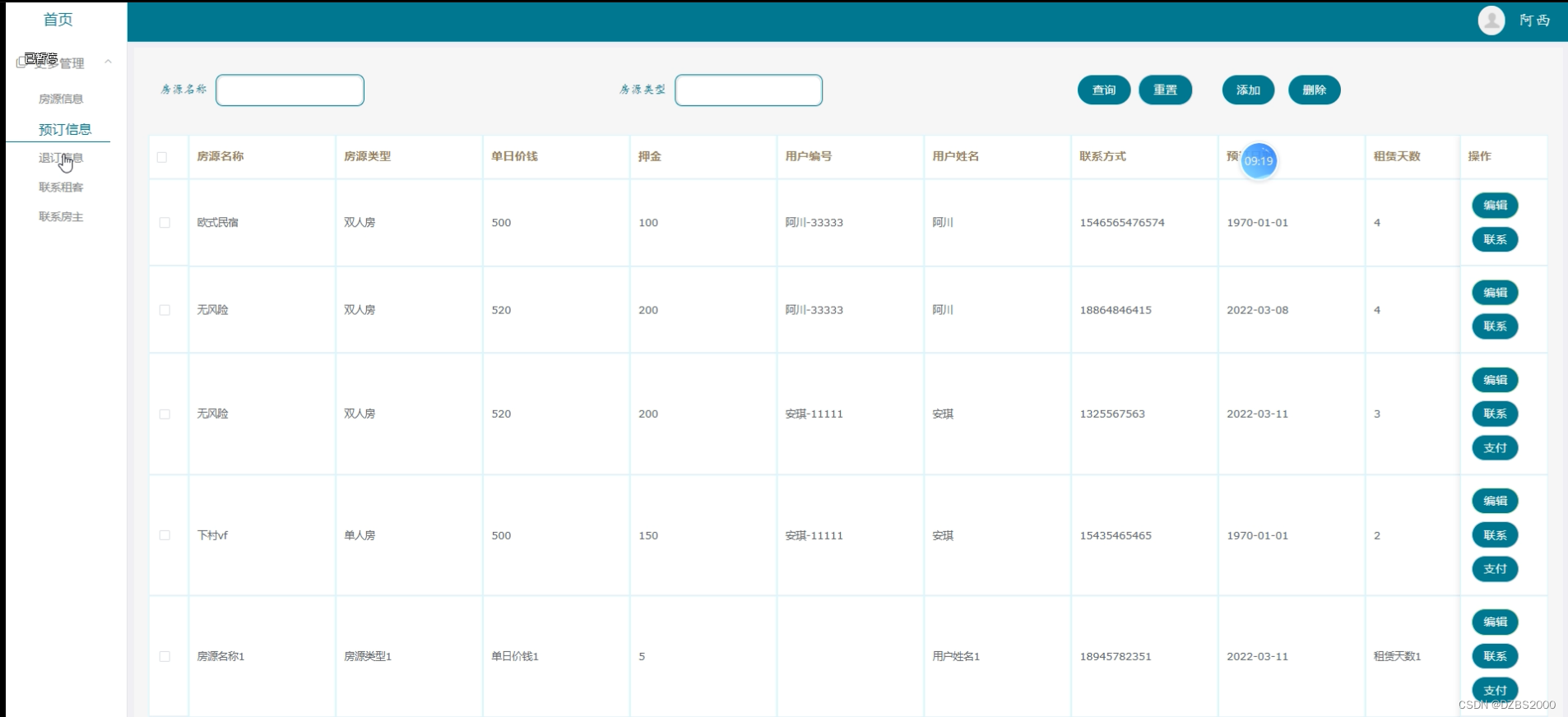 预订信息管理,在预订信息管理页面中可以、房源名称、房源类型、单日价钱、押金、用户编号、用户姓名、联系方式、预订日期、租赁天数等信息,还可进行联系、支付等操作,如图5-8所示。