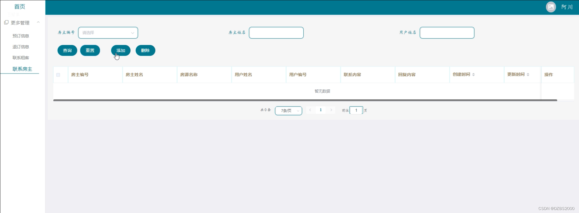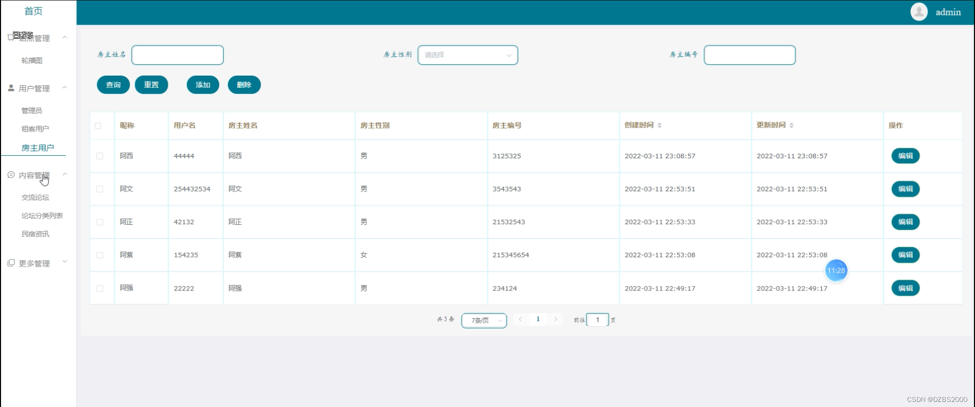 房主用户管理,在房主用户管理页面中可以添加房主信息:昵称、用户名、房主姓名、房主性别、房主编号等信息,并可根据需要在房主查询页面对房主信息进行修改或删除详细等操作,如图5-12所示。