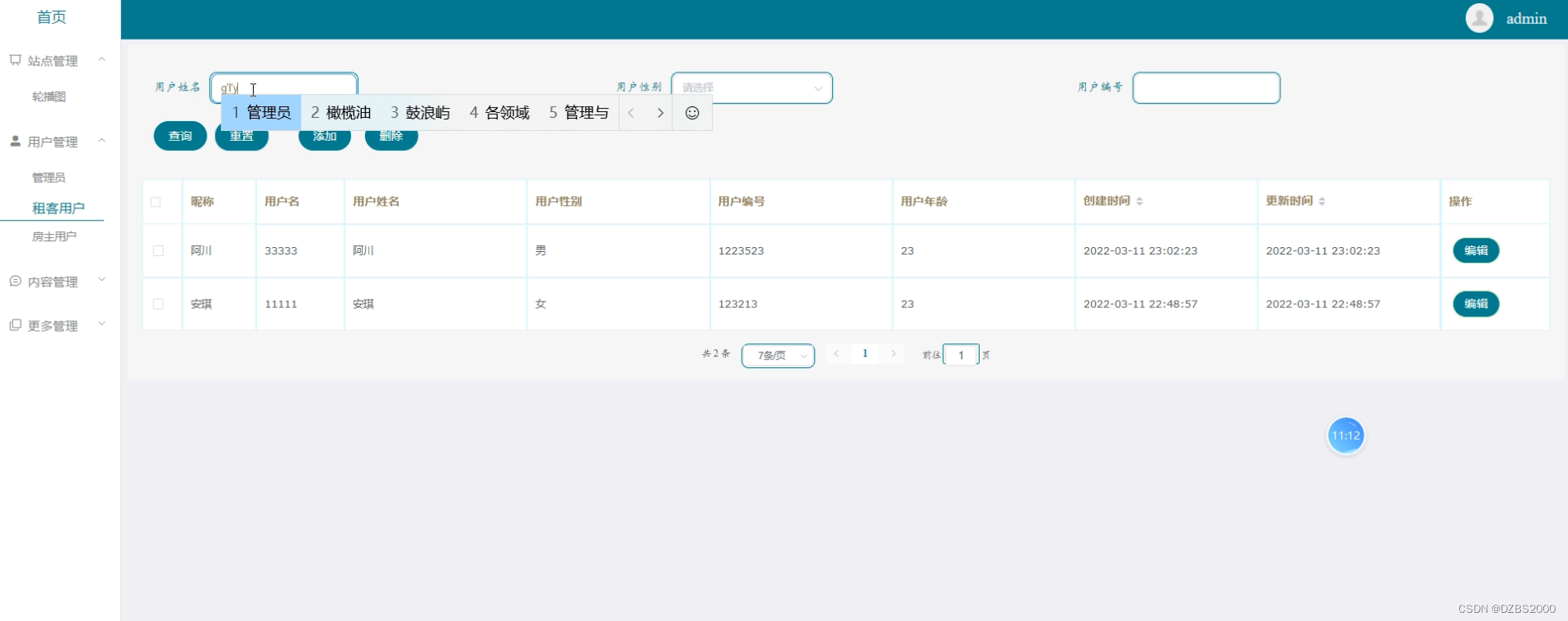 租客用户管理,在租客用户管理页面中添加昵称、用户名、用户姓名、用户性别、用户编号、用户年龄等信息,并可根据需要在租客查询页面对租客信息进行修改或删除详细等操作,如图5-11所示。